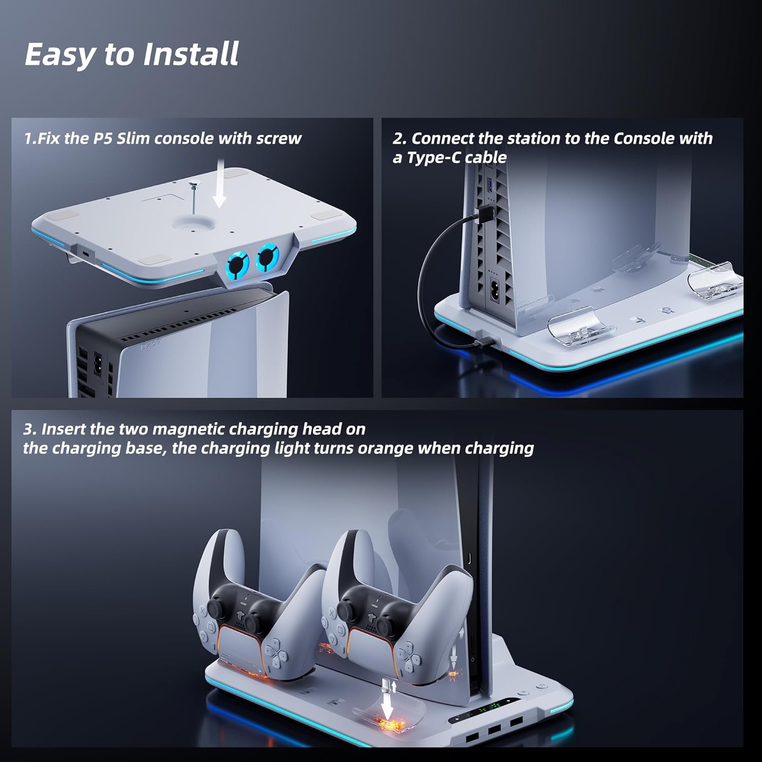 【2023 NEW PS5 Slim Console Stand 】Compatible with both the PS5 Slim Disc and Digital Edition consoles.The charging stand also comes with a safety screw to attach to console to make the dock more secure and balanced. A best gift for friends, sons, father and people who like to play PS5 games