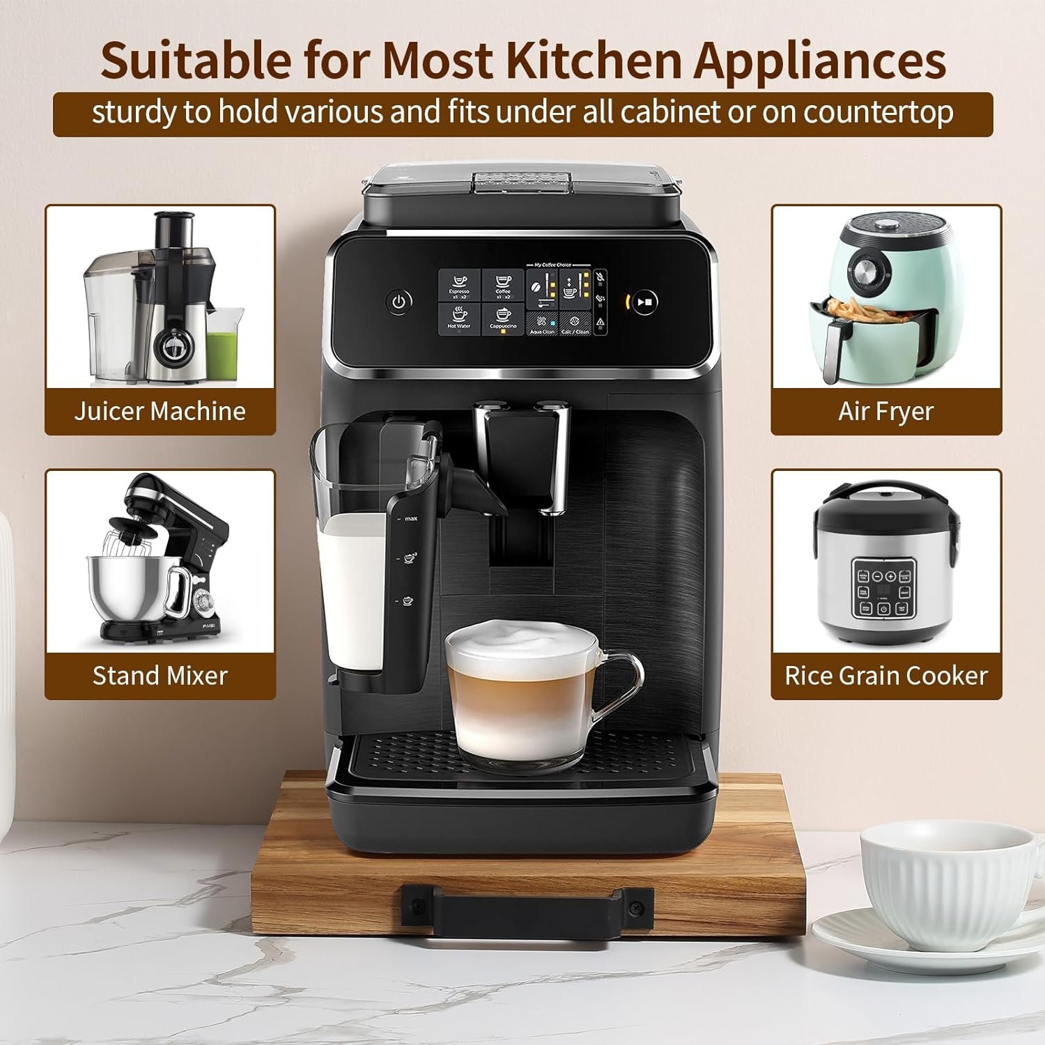 Compatible with various light or heavy kitchen machine or home appliances such as coffee maker, espresso maker, coffee pot, stand mixer, blenders, toaster, electric teapot, food processors, ice machine, and other countertop kitchen appliances.