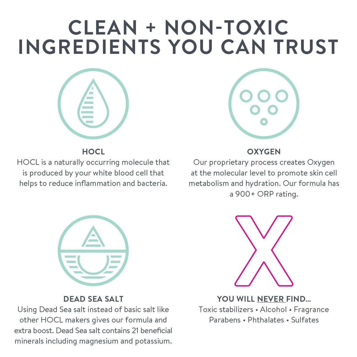 OXYGEN + HYPOCHLOROUS ACID (HOCL): Our Proprietary Technology Allows The Oxygen To Remain At The Molecular Level + Our HOCL Is 100% Naturally Stabilized. HOCL Is Naturally Found In Your White Blood Cells + Helps Defend Against Harmful Invaders While Promoting Healing.
