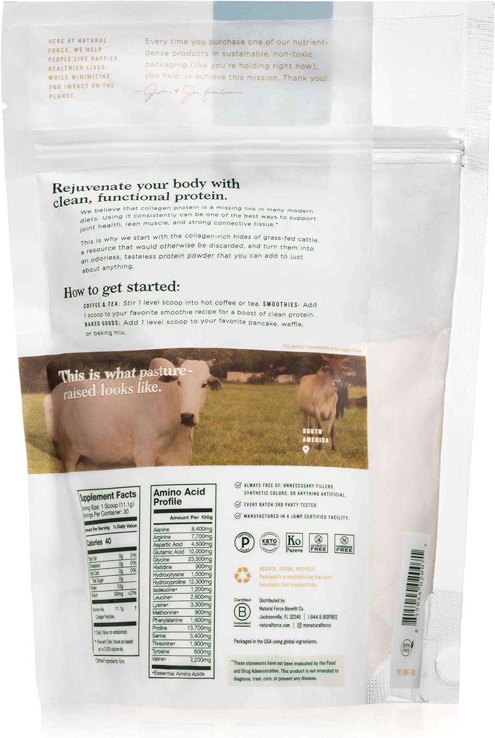 Grass Fed, Pasture Raised, & Certified Keto, Paleo, & Kosher – Natural Force Collagen Peptides are sourced exclusively from grass fed, pasture raised cattle that graze freely and are never given antibiotics, hormones, or GMOs.
