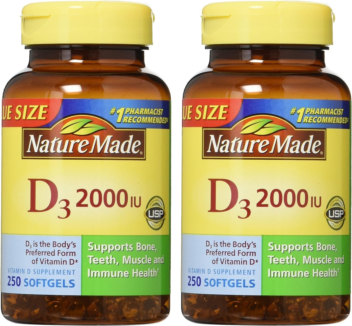 Immune, muscle, teeth and bone health support supplement: contains one 250 count bottle of Nature Made Vitamin D3 2000 IU (50 mcg) Softgels for a 250-day supply