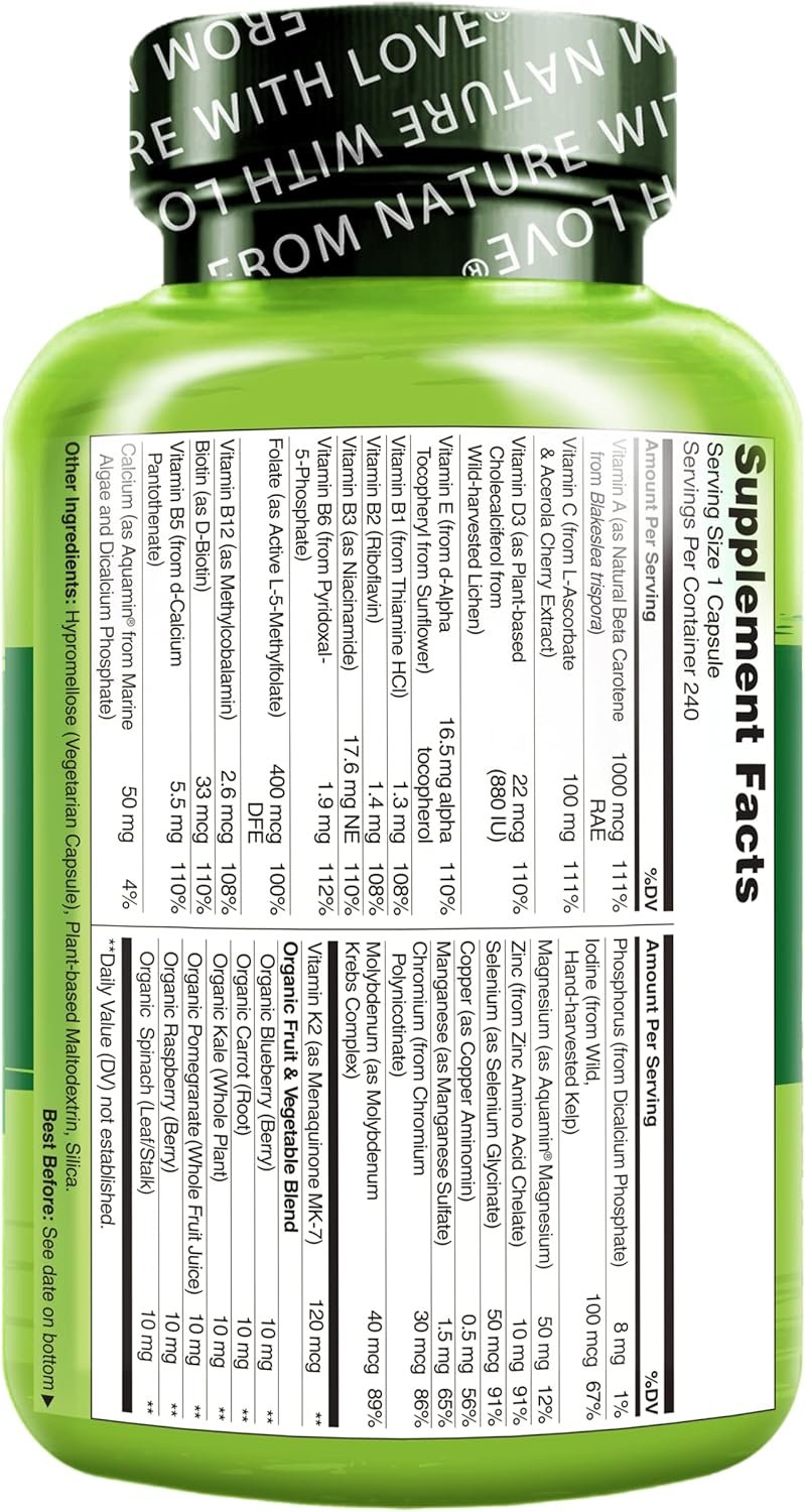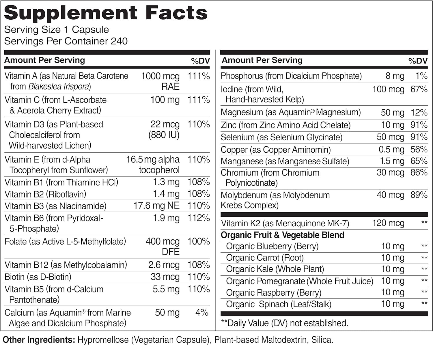 Plant-Based: Featuring premium plant-based vitamins and minerals including as Vitamin D3 from lichen, Vitamin E from sunflower, plant Calcium and Magnesium from marine algae, and Iodine from kelp.