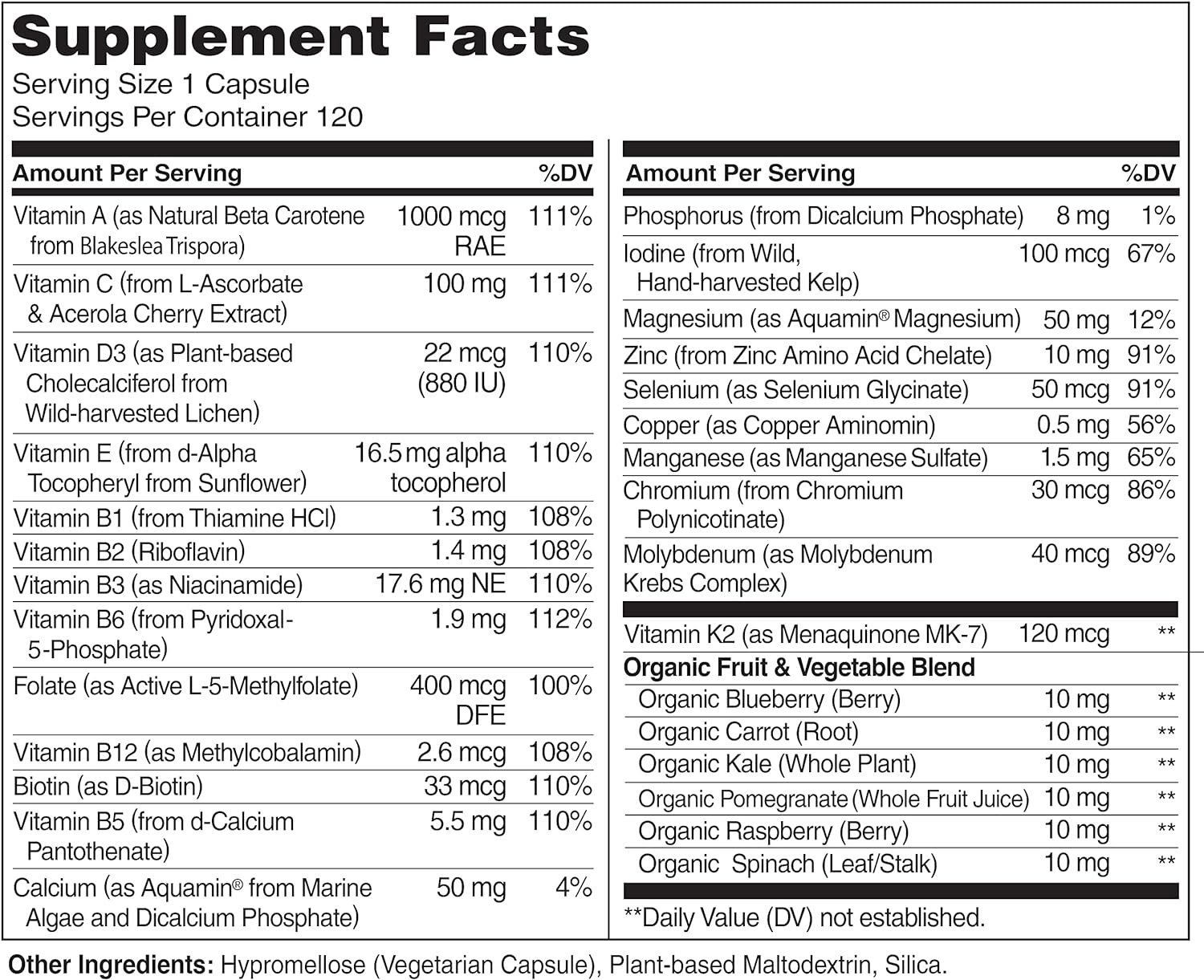Plant-Based: Featuring premium plant-based vitamins and minerals including as Vitamin D3 from lichen, Vitamin E from sunflower, plant Calcium and Magnesium from marine algae, and Iodine from kelp.