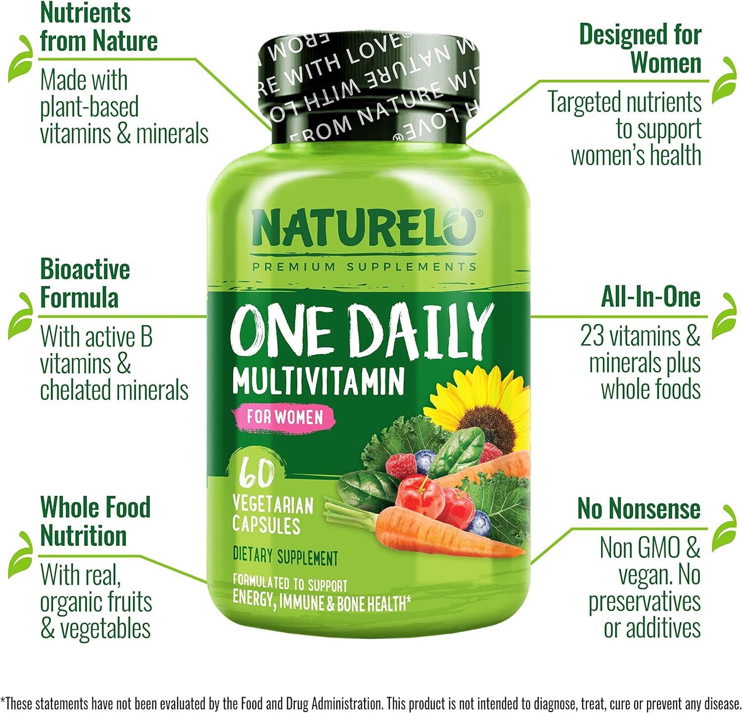 All-In-One: Packed with 24 essential vitamins and minerals to support women’s health, plus organic fruits and vegetables for whole food nutrition and antioxidant support, all in just one daily multivitamin for women.