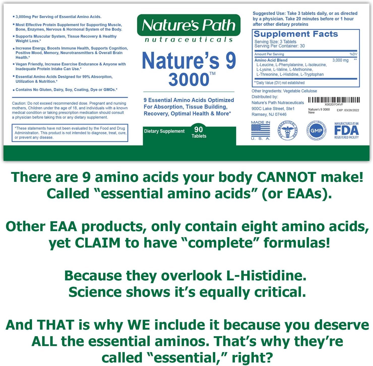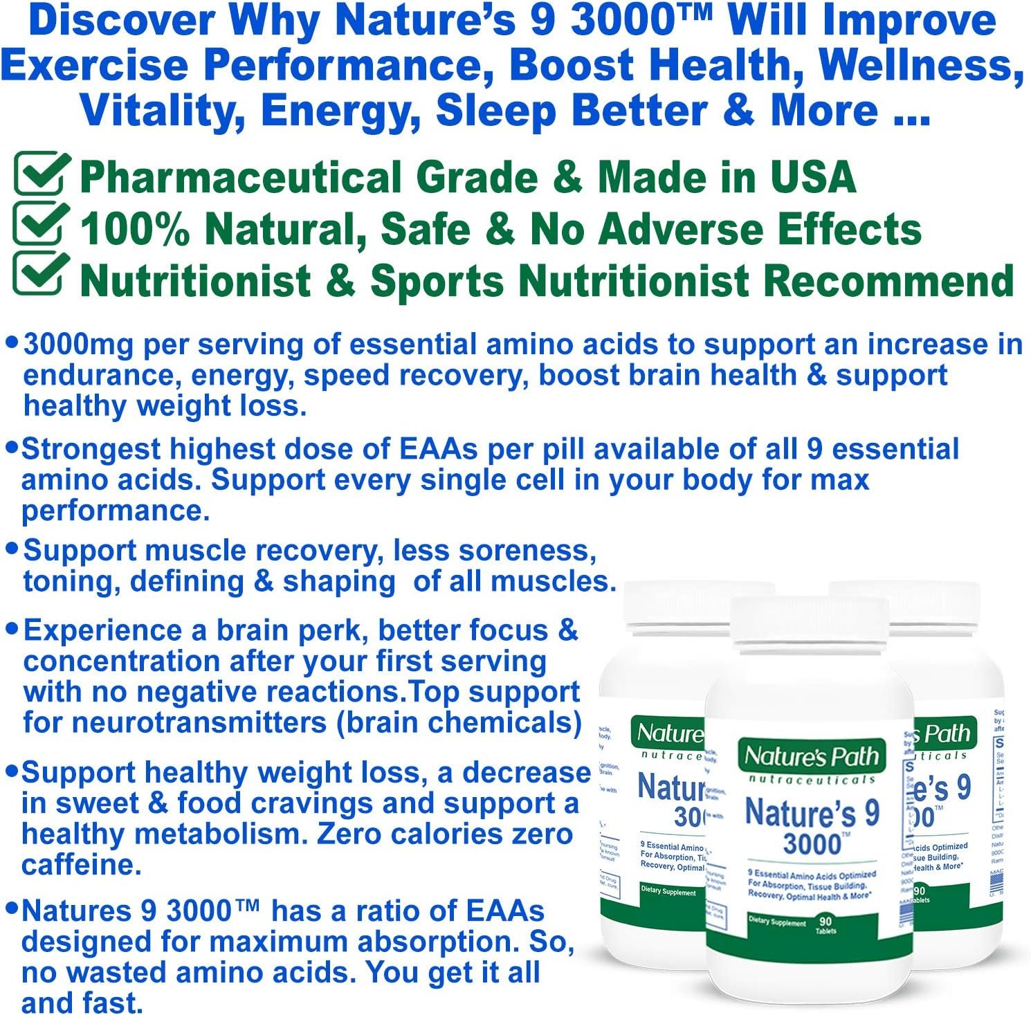 MOST POTENT To equal our EAA easy to swallow tablet potency, you’d need to take about 7-10 essential amino acid pills a day of other brands, with ours you only need 3. Experience all natural mental & physical gains. Build lean muscle not bulk. Supports active lifestyles or to support recovery from injury or illness. Natures 9 3000 is for you! Created by essential amino acid, bcaa and amino acid world experts. Learn more see graphics & keep reading the description