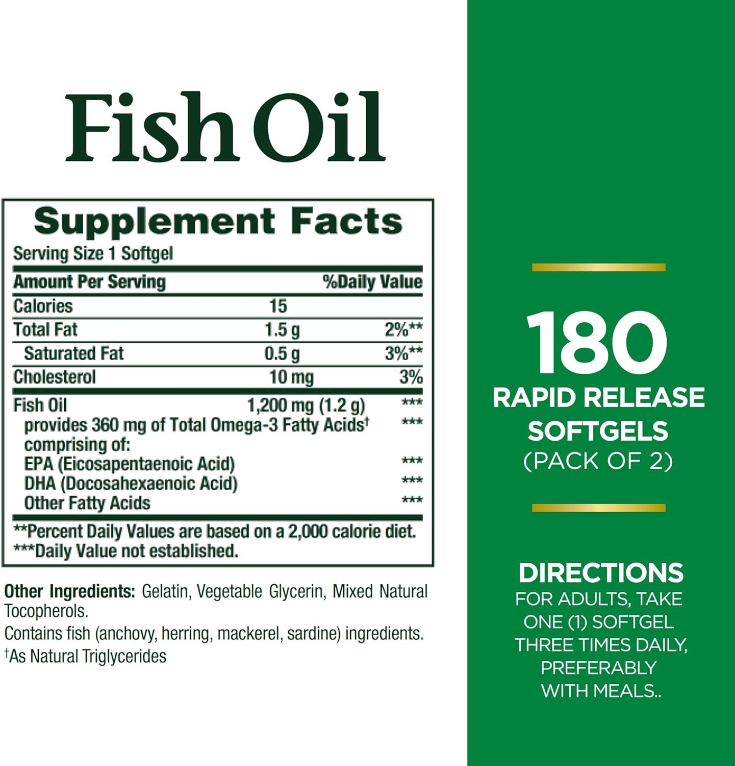 Support your heart, cellular and metabolic health with Nature’s Bounty 1200 mg Fish Oil Coated Softgels. (1) Each serving contains 360 mg of Omega-3 fatty acids, including EPA and DHA, which help to support and maintain the health of your cardiovascular system. (1) Omega-3 fatty acids are considered “good” fats and may help to maintain triglyceride levels already within a normal range. (1) Searching for a fish oil supplement without the strong aftertaste? Our softgels make it easy to get the fish oil you want without the strong unpleasant fishy aftertaste. As part of our commitment to safety and purity, Nature’s Bounty Fish Oil Softgels are purified to eliminate mercury, contain no shellfish, and are gluten free, sugar free and lactose free. Each twin pack includes 360 rapid release softgels. (1)These statements have not been evaluated by the Food and Drug Administration. This product is not intended to diagnose, treat, cure or prevent any disease. (2) Supportive but not conclusive research shows that consumption of EPA and DHA omega-3 fatty acids may reduce the risk of coronary heart disease. One serving of Nature’s Bounty 1200 mg Fish Oil softgel provides 360 mg total of EPA, DHA and other omega-3 fatty acids