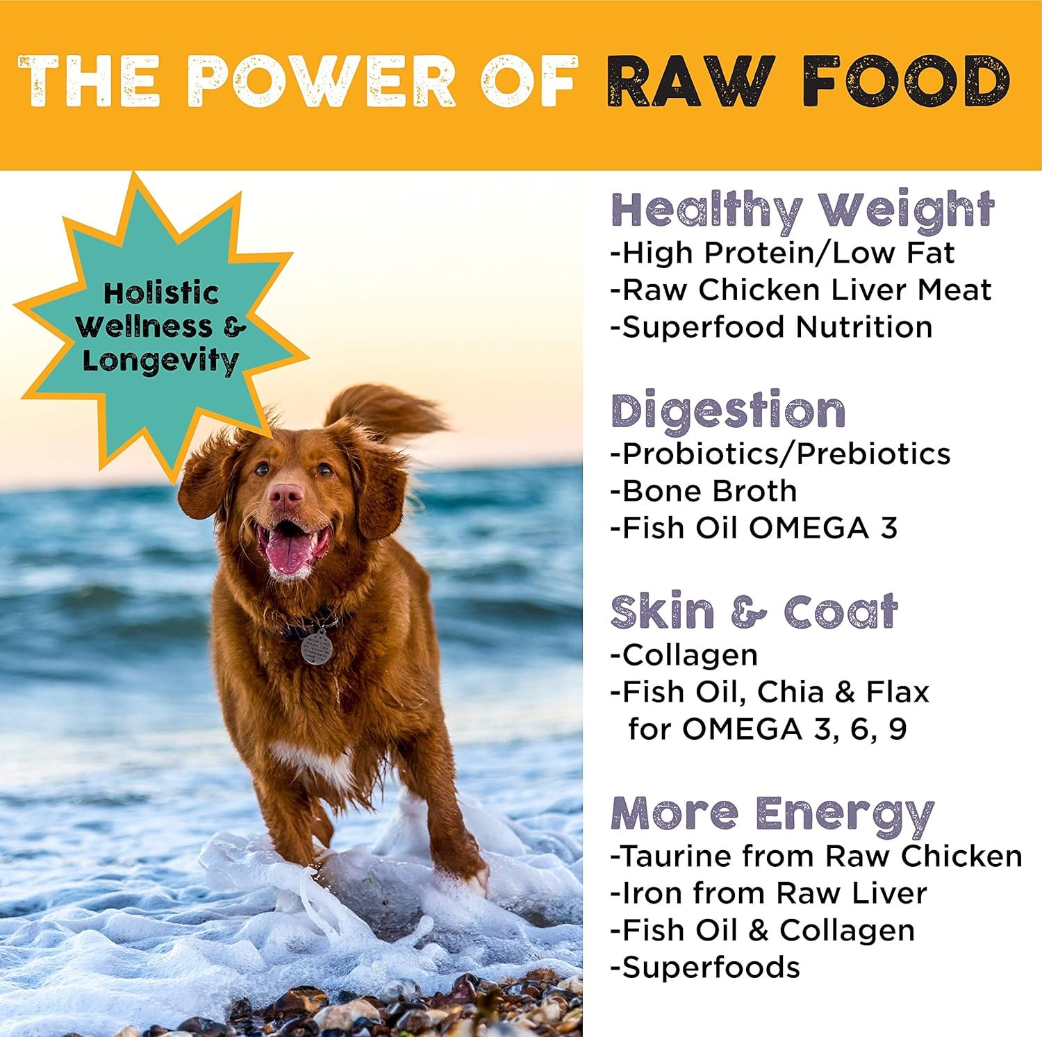 Bone Broth & Chicken Liver : Our Raw Coated kibble is not only covered in irresistible, nutrient rich raw chicken liver – there is also a full serving of dried bone broth with more protein than the leading liquid bone broth in every bowl.