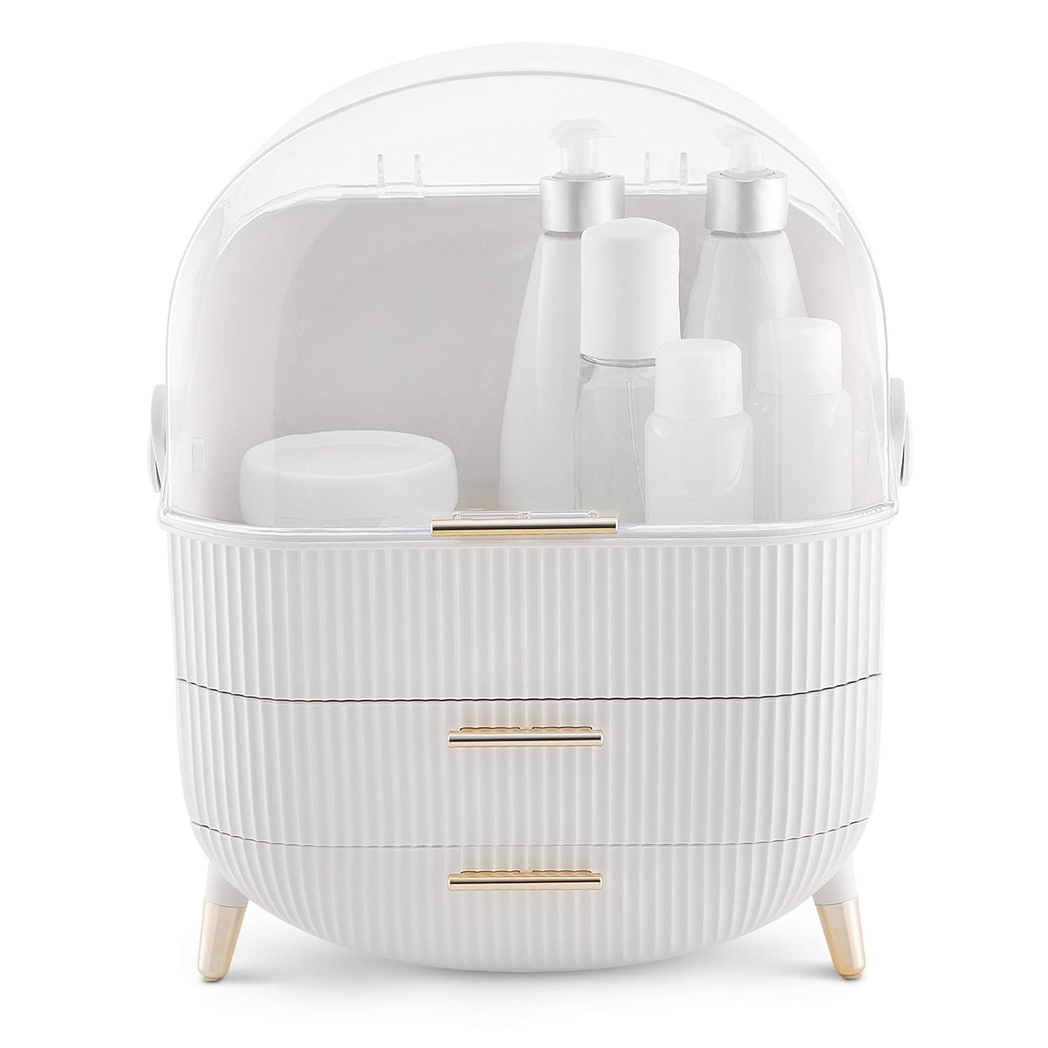 Navaris Makeup Organizer Storage Box – Cosmetics, Skincare and Beauty Case with Clear Lid Display and 2 Drawers – Bathroom Counter or Vanity – White