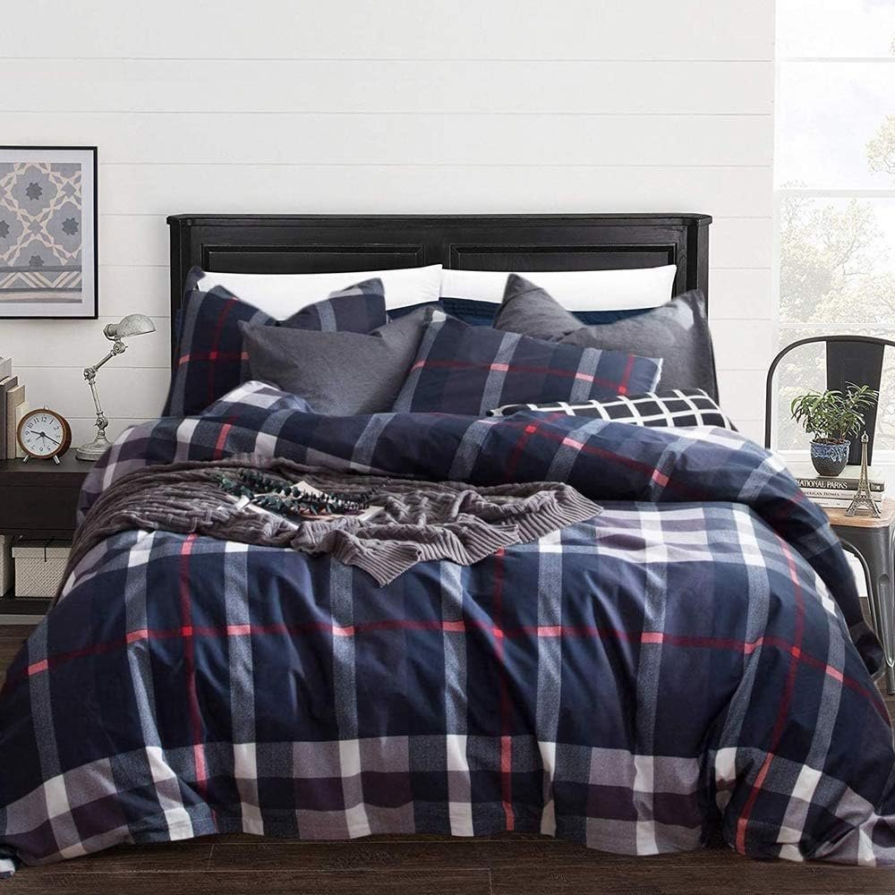 Navy Plaid Bedding Set (3PCs): 1 Comforter(90″ x 90″), 2 pillow shams(20″ x 26″).