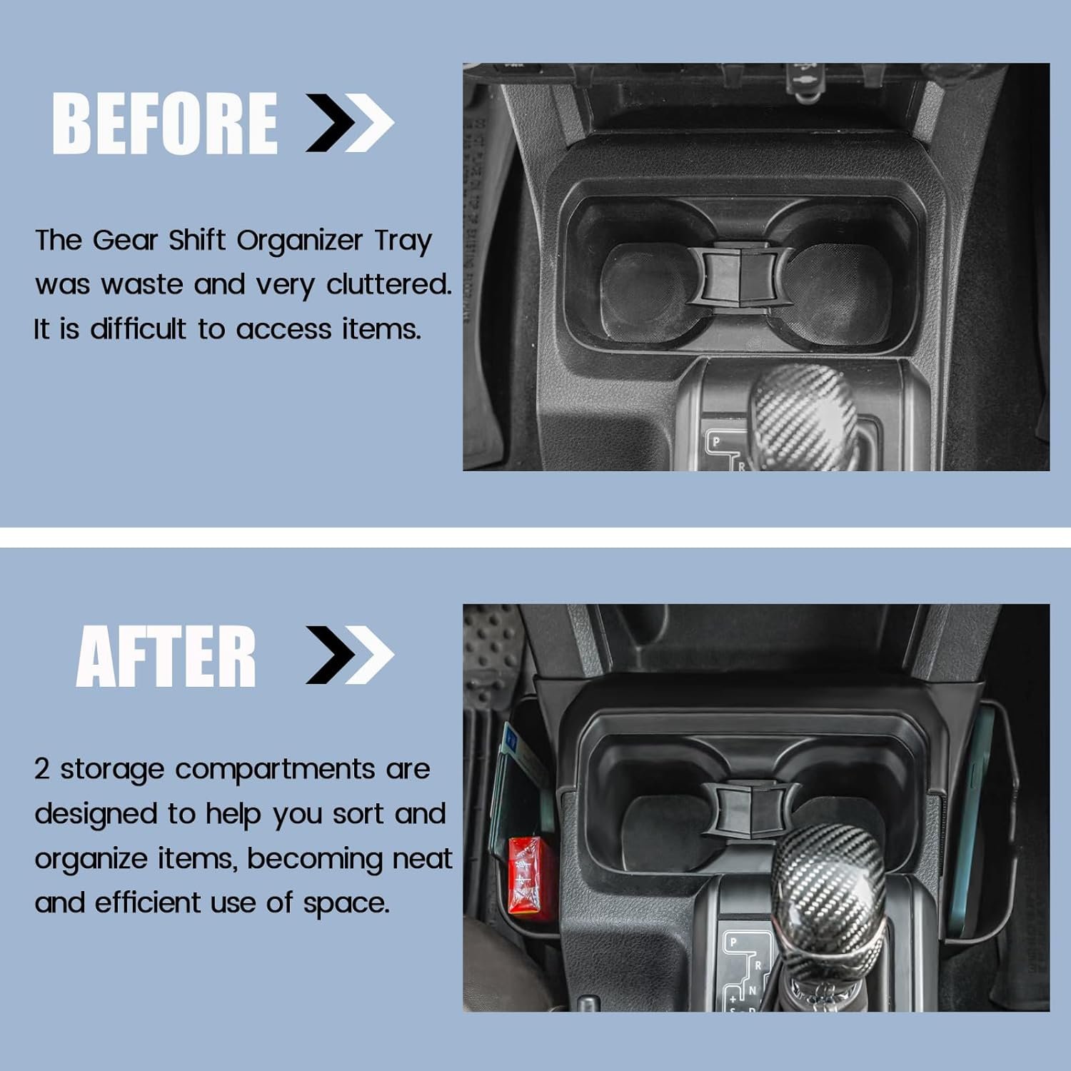 【Will not hinder you】The gear shift tray is moderate in size, smooth edges, will not rub your legs, let alone hurt you.