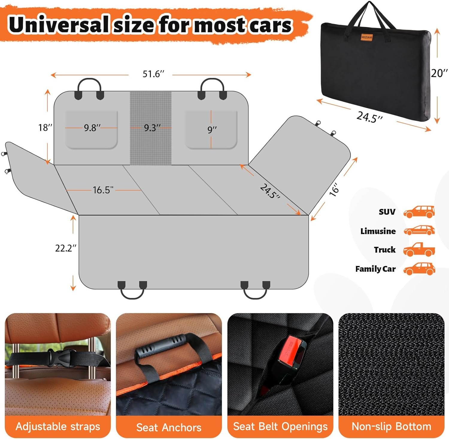 【One Size Fits Most Cars】The size of dog seat cover for back seat is 52*25in,suitable for most cars, trucks and SUVs. with two extended side wings,you can use the straps to hang on the safety handle above the door and zipper it up to turn into a dog hammock for car, which effectively prevents dirt and fur residue while protecting the door from scratches.