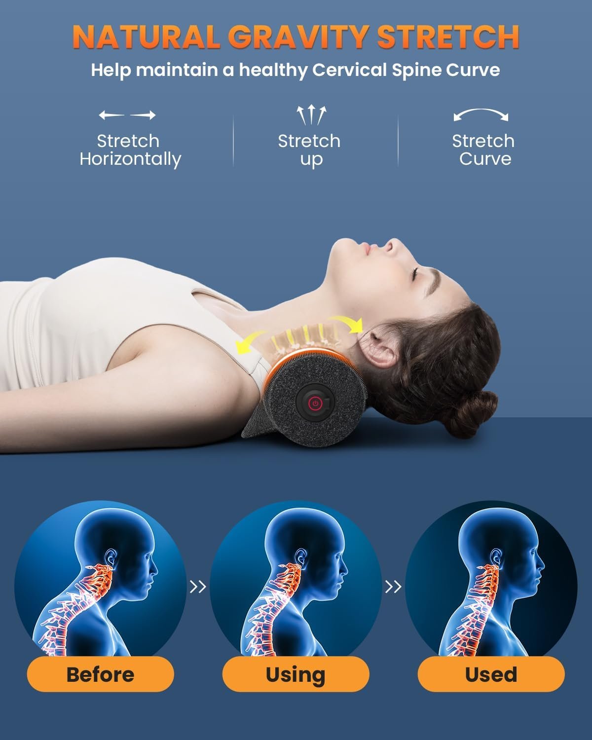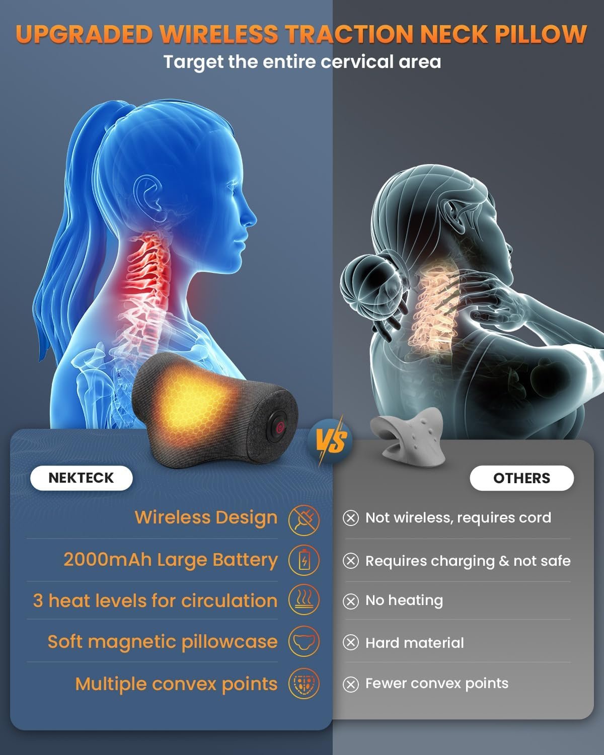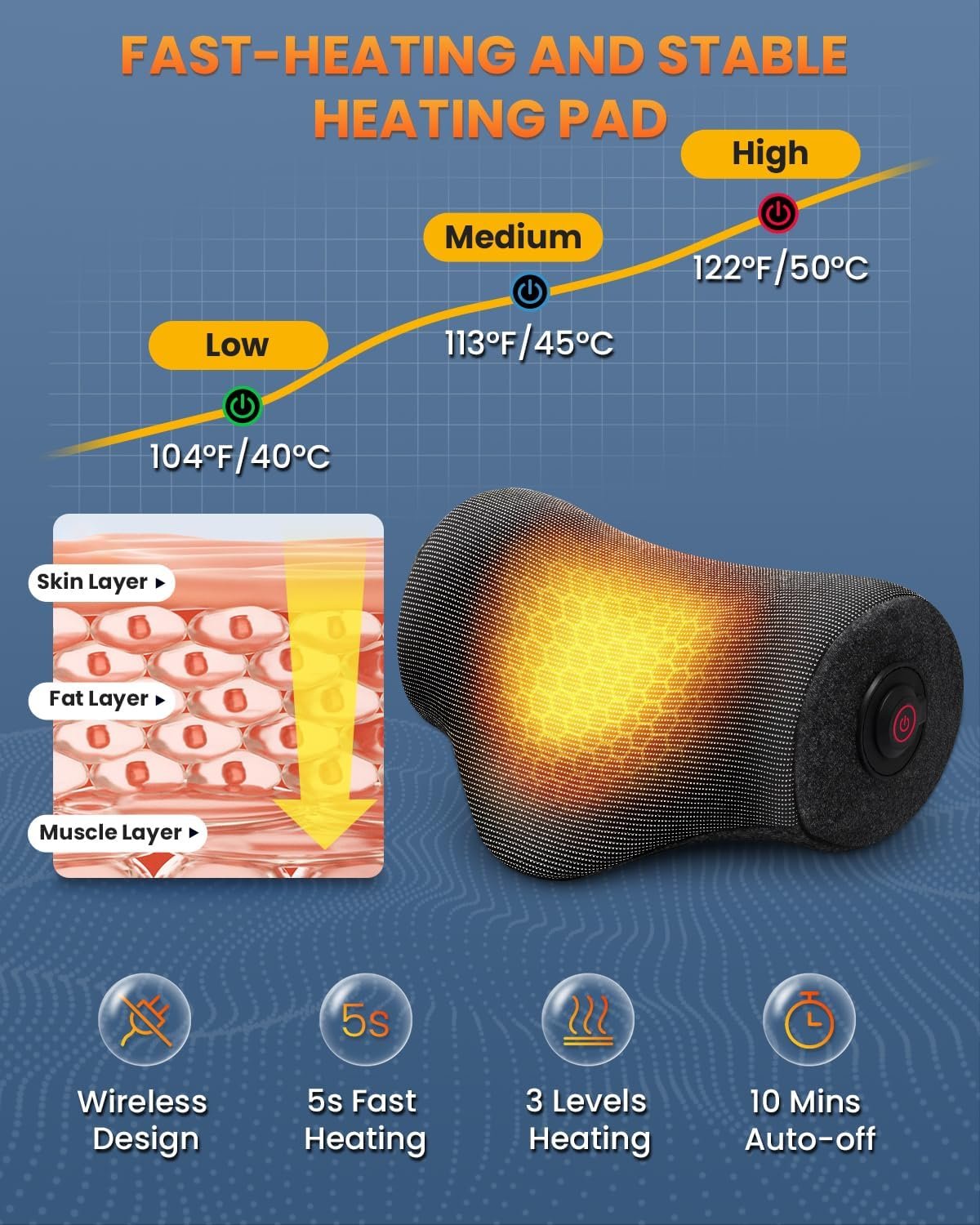 Upgraded Wireless Rechargeable: Completely different from an ordinary cervical traction pillow, our cordless neck and shoulder relaxer doesn’t need to connect to the charging cable during use, making it safe and convenient without being constrained by distance or sockets. With a built-in 2000mAh battery, it can be used for 2.5 hours once fully charged. Compact and lightweight, it allows you to address neck problems wherever you go.