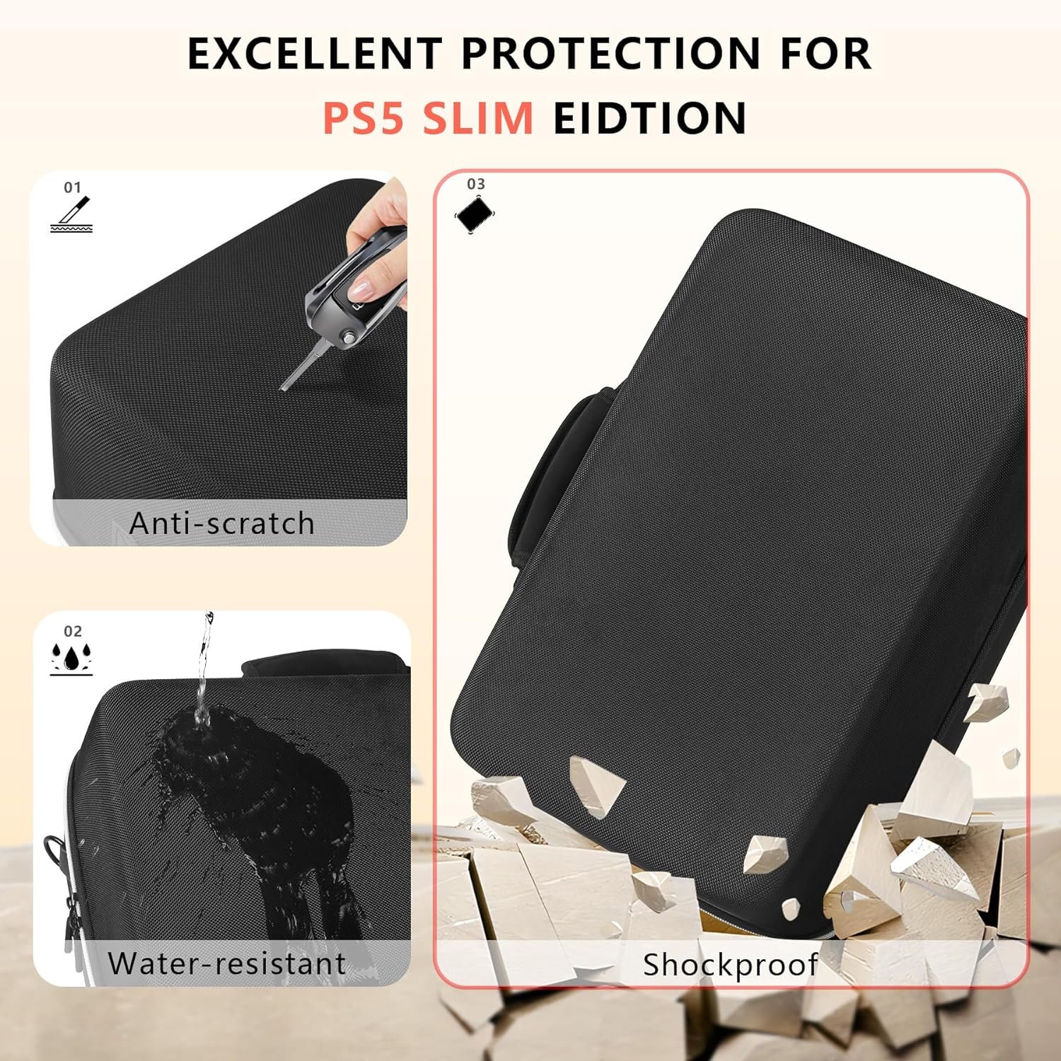 【Outstanding Material & Protection】: The travel case for ps5 Slim is made of scratch-resistant nylon cloth, EVA hardshell and soft lining. The combination of hard shell and interior compartments can keep everything safe inside the case.