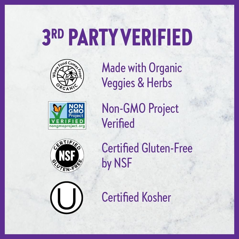 Made with Certified Organic Vegetables, Non-GMO Project Verified, Vegetarian, Certified Kosher, Certified Gluten- Free by NSF, No Artificial Flavors or Colors