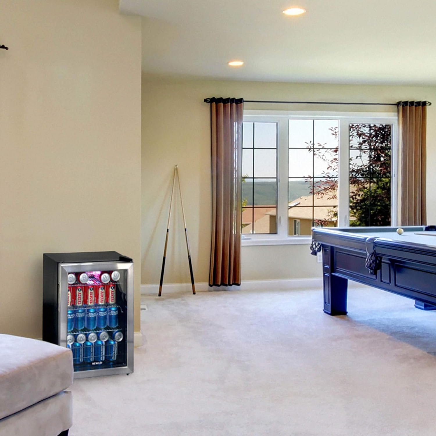 The Newair 90 Can Compact Beverage Fridge features a powerful compressor cooling system that keeps your drinks at a consistently chill 37 degrees for optimum refreshment. Choose from 7 custom thermostat settings to keep beer and soda at the perfect temperature for serving.
