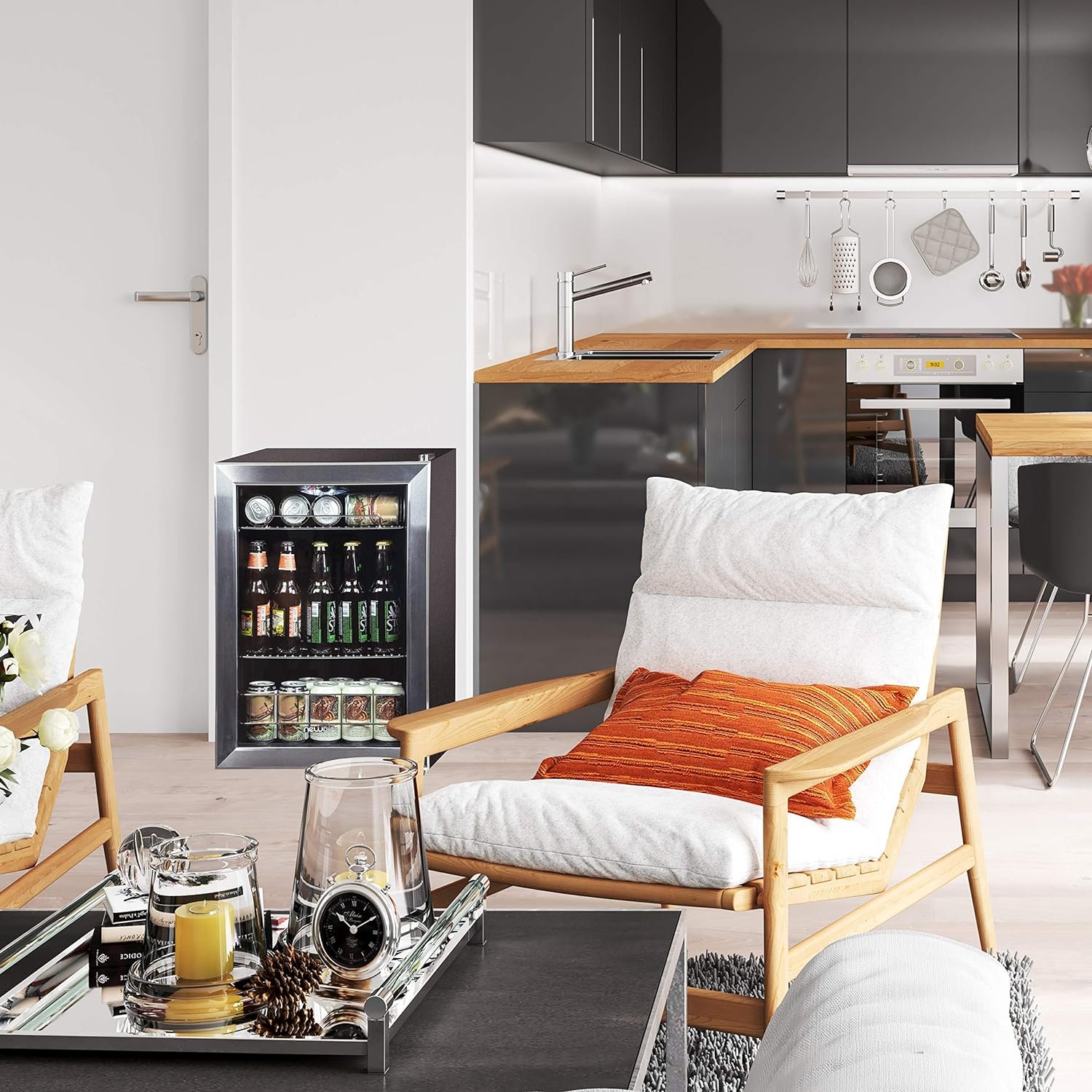 The Newair 90 Can Compact Beverage Fridge doesn’t require special installation or new cabinets to get started – just plug it in and you’re ready to go. Its stainless-steel door and LED interior light guarantee that it looks great anywhere.