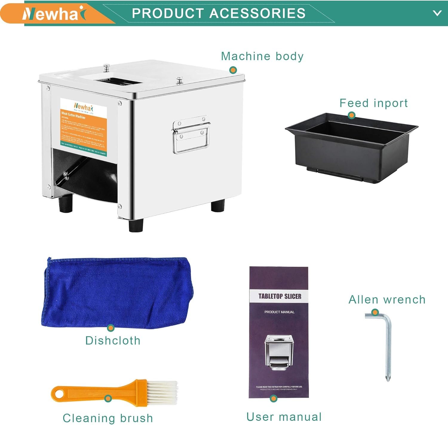 This machine is mainly used to cut fresh boneless meat, can not cut hard vegetables, like potatoes, carrot!!!