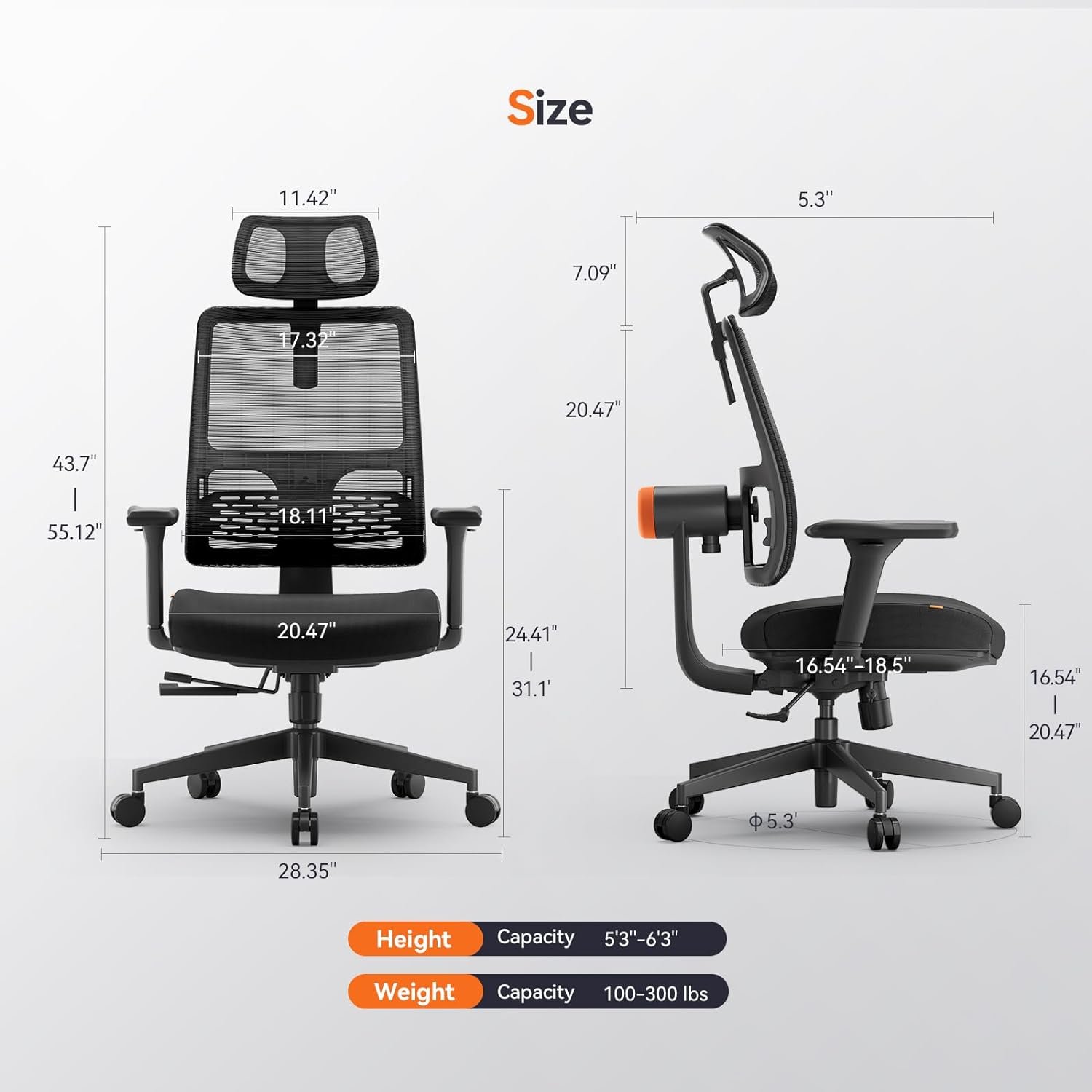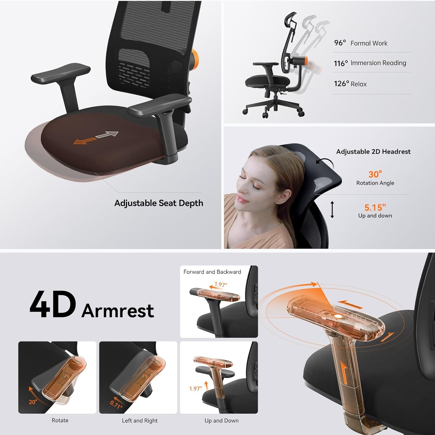 [Personalized Comfort in A Glance] The back of the Newtral ergonomic chair has three height options, and it can be tilted and locked from 96° to 126°. The angle and height of the headrest are adjustable. The seat can be lifted up and down, moved back and forth, also equided with the 4D adjustable armrest. You can find the most comfortable support position and strength for your body, whether you are working, playing games or resting.