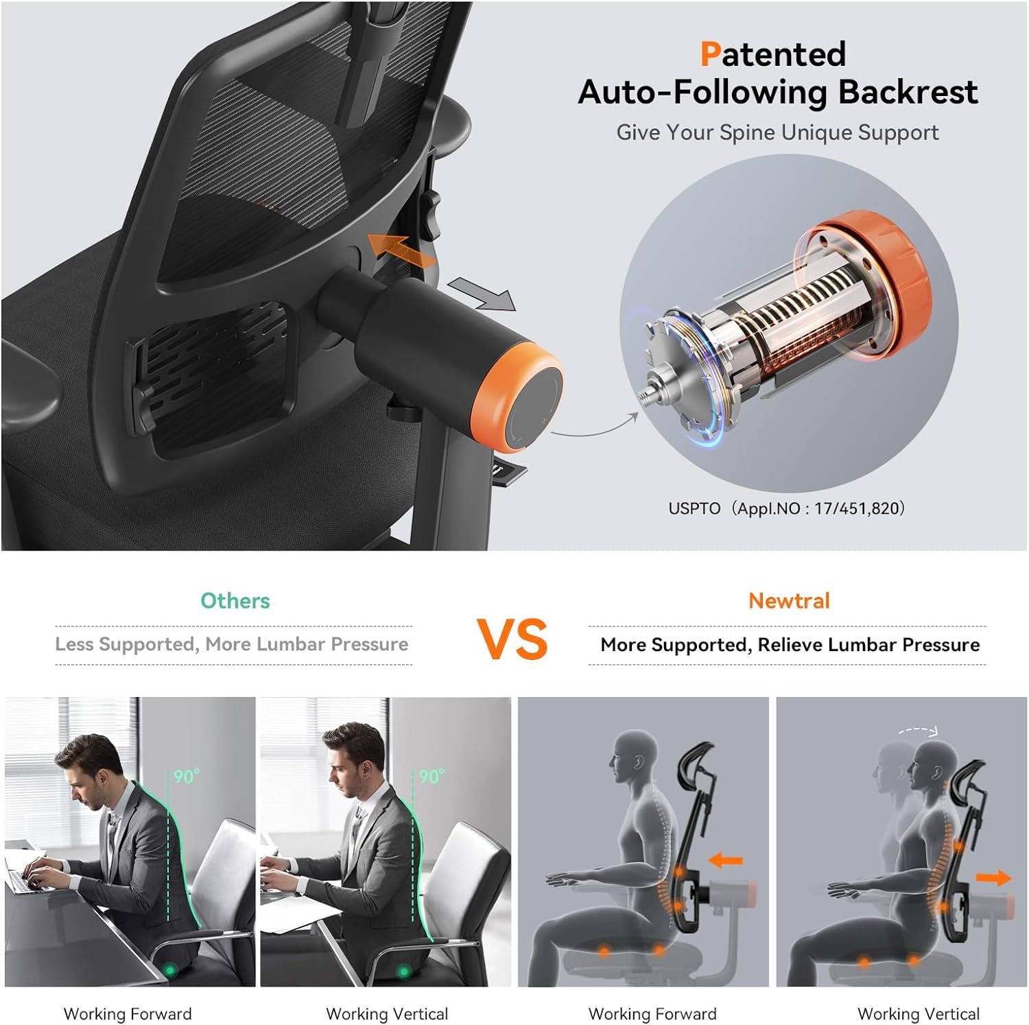 [Ergonomic Lockable Auto-following Lumbar Support] Newtral office chair uses innovative automatic lumbar tracking technology to automatically follow the movement of your lumbar spine, providing strong support for your lower back throughout the day. Lumbar support strength can be adjusted according to your needs. It fits the natural curvature of your spine and helps relieve back pain caused by sitting for too long.