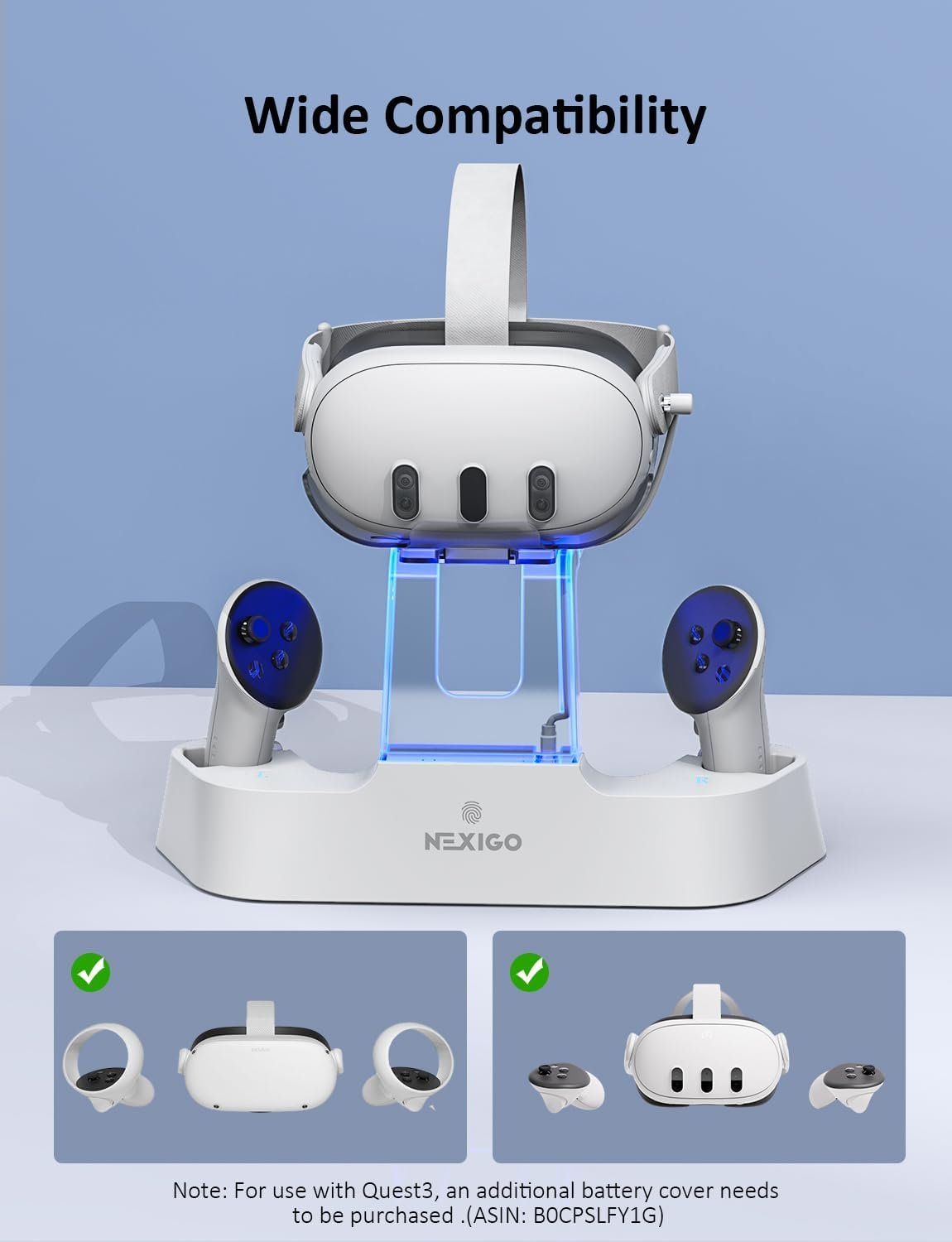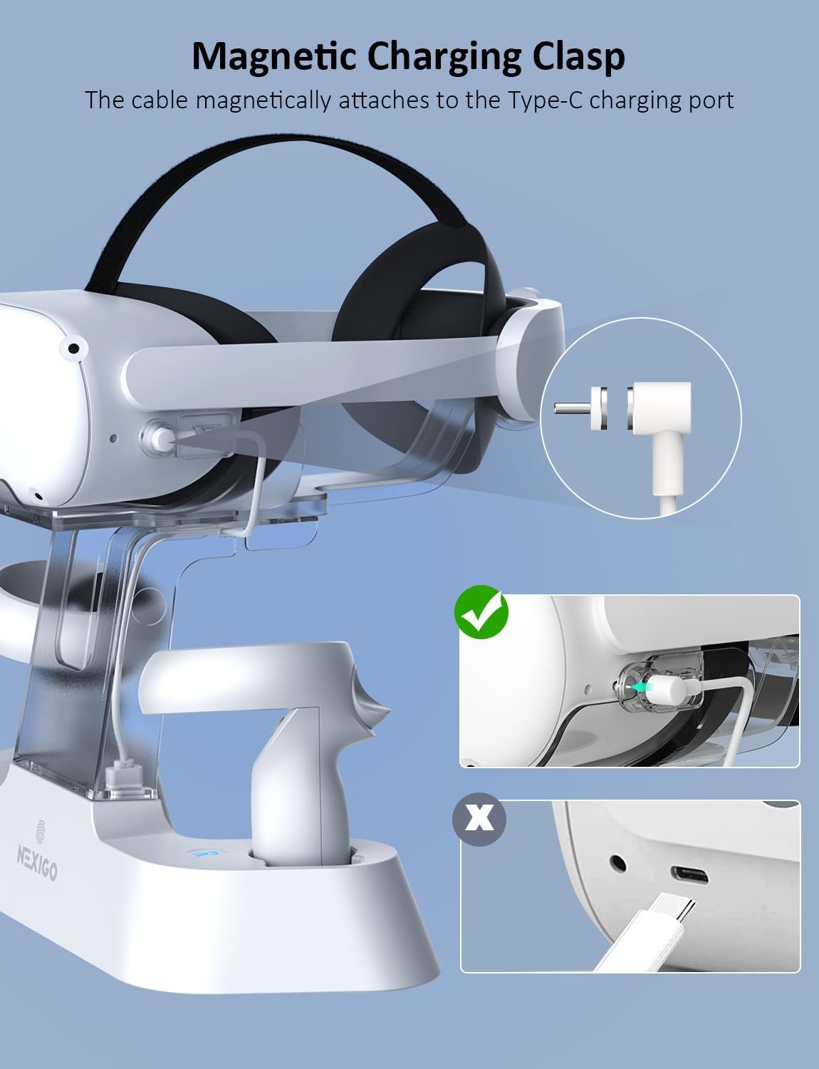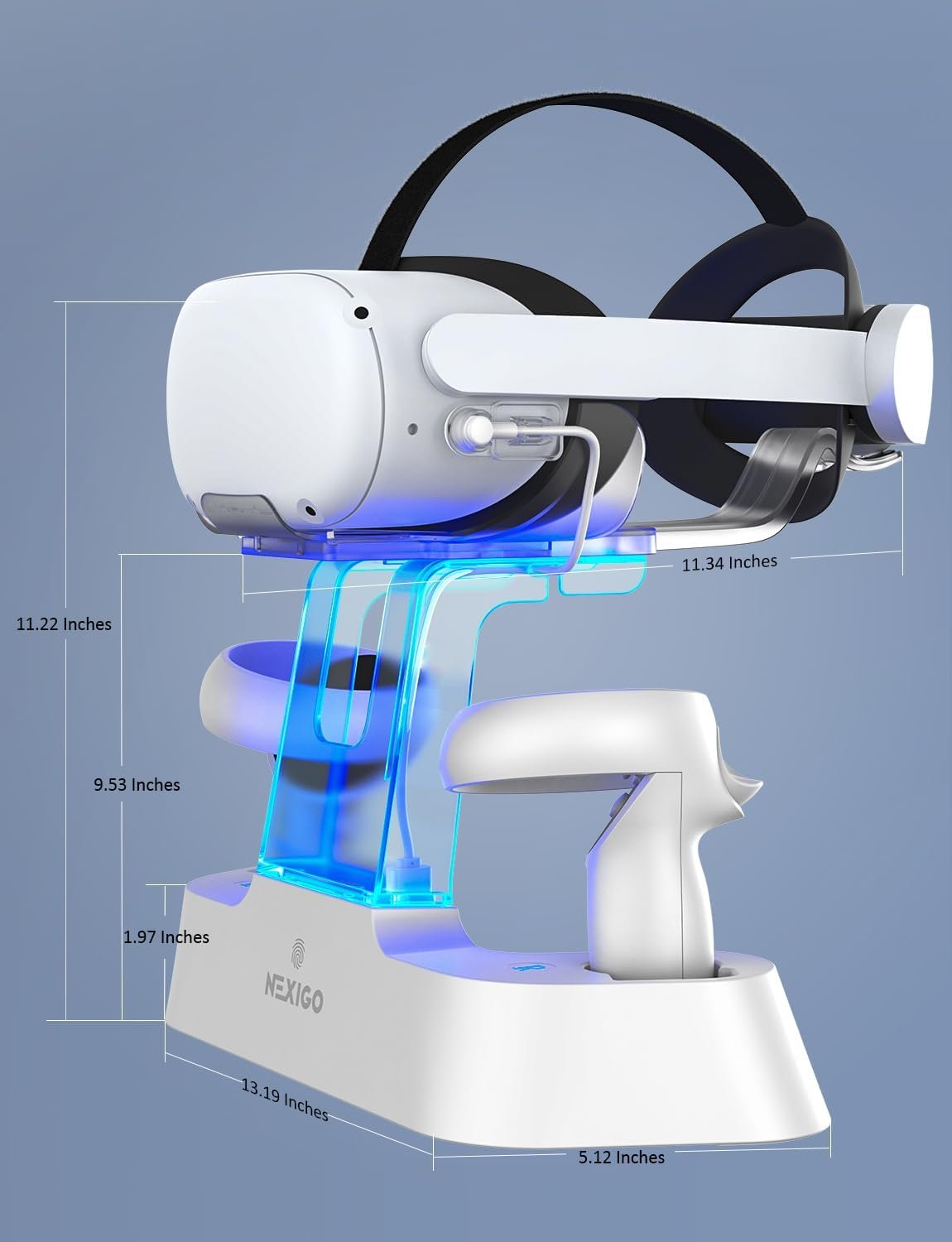 【Convenient LED Indicators】The NexiGo Charging Station is designed with LED lights in the support column and on the left and right sides of the base to indicate the charging status of the docked headset and controllers. It’s easy to tell when your accessories are charged: orange while charging, and blue when fully powered.