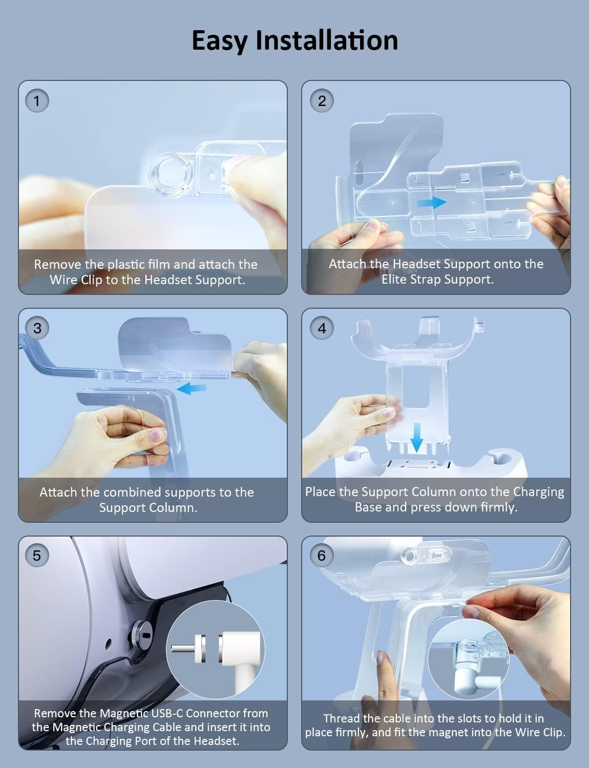 【Fast Charging】Fully charge your headset and Touch Controllers in ~3.5 hours. After assembly is completed, place the headset on the charging dock, and attach the magnetic charging cable to the connector.
