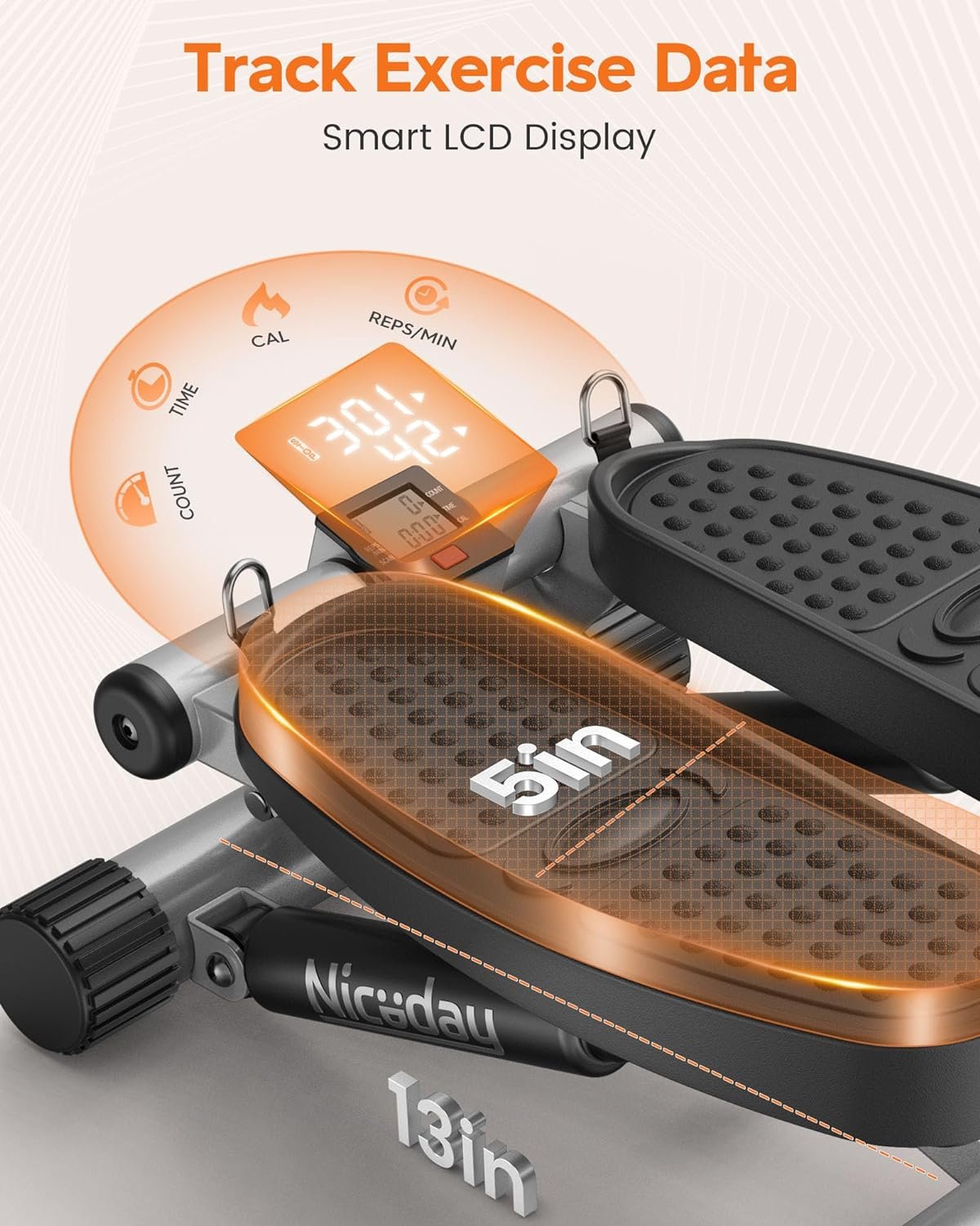 【Space Saving & Easy Storage】The size of the Niceday stepper is 16*12*14IN and only requires a footprint of 1.29FT². You can store it in any tight corner.