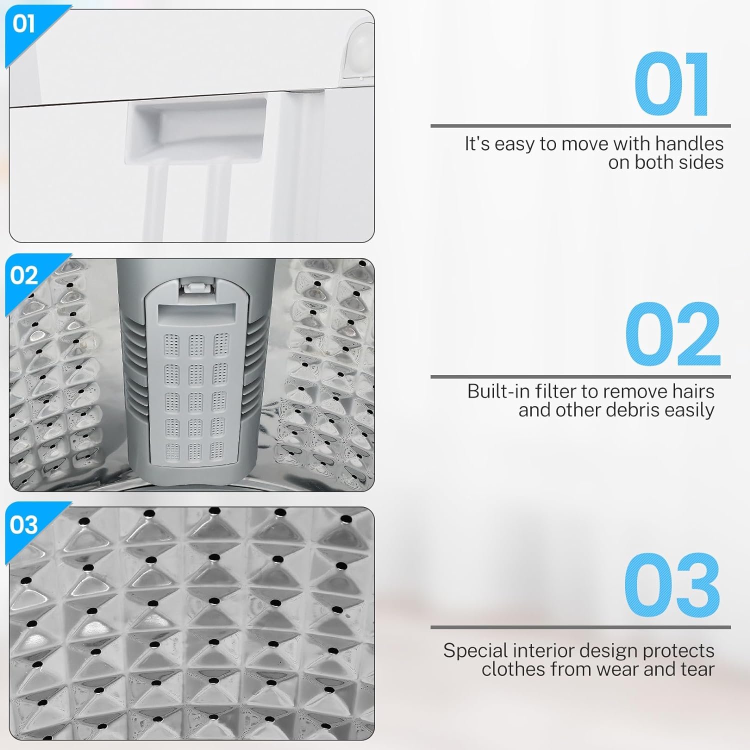 šćLarge Capacity & Space Savingć The honeycomb stainless steel inner can hold 17.8 lbs of laundry at one time, allowing washing multiple clothes, perfect for home use. This small washing machine is lightweight and compact, featuring two side handles and adjustable bases, making it ideal for tight spaces such as apartments, RVs, homes, and dormitories.