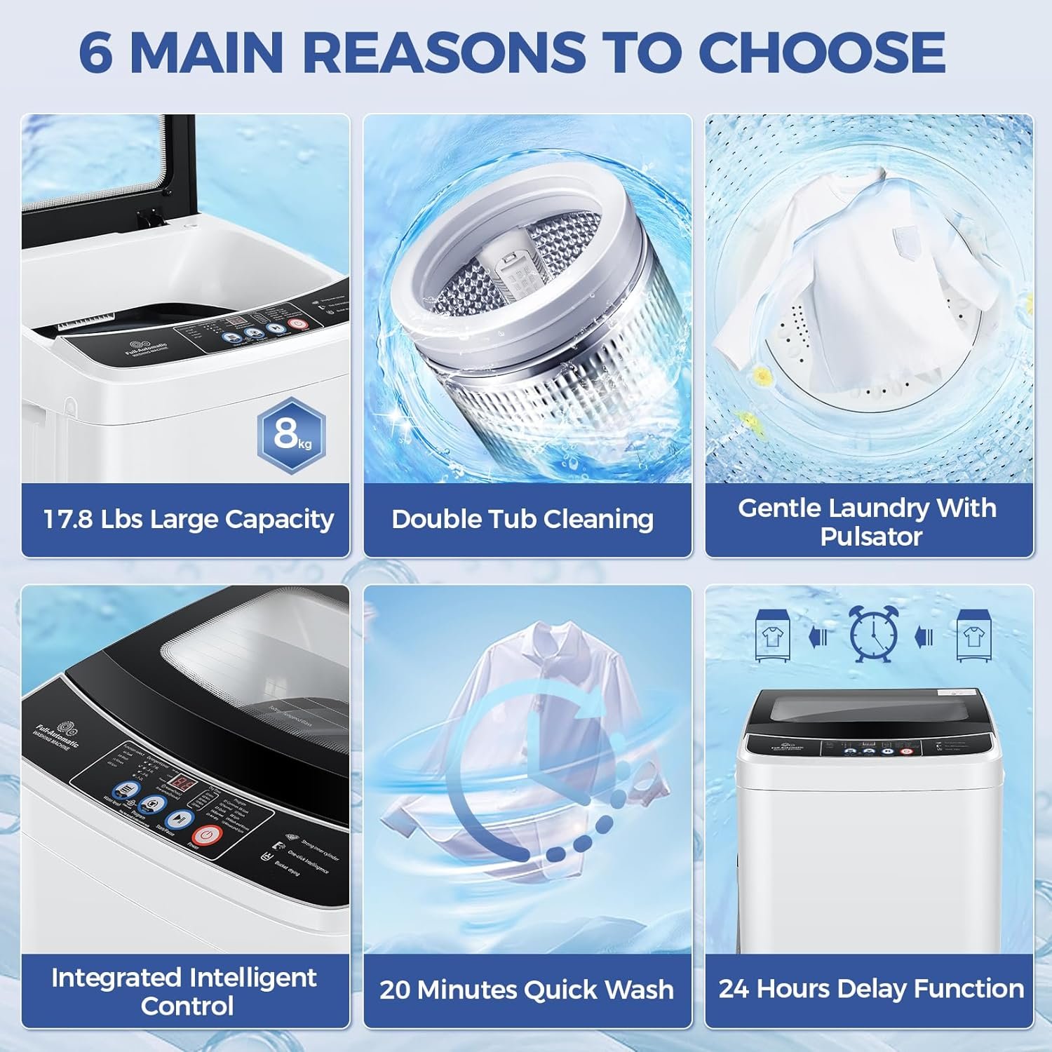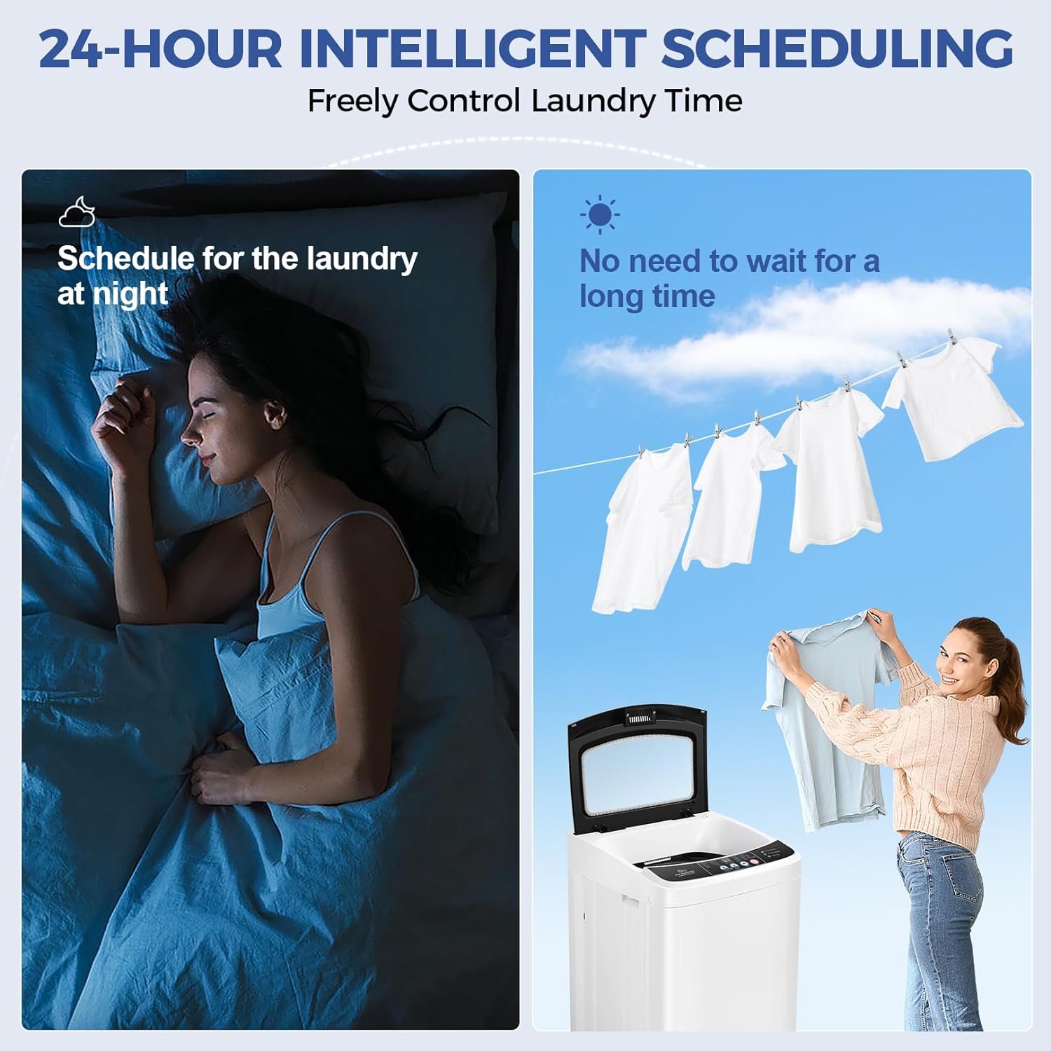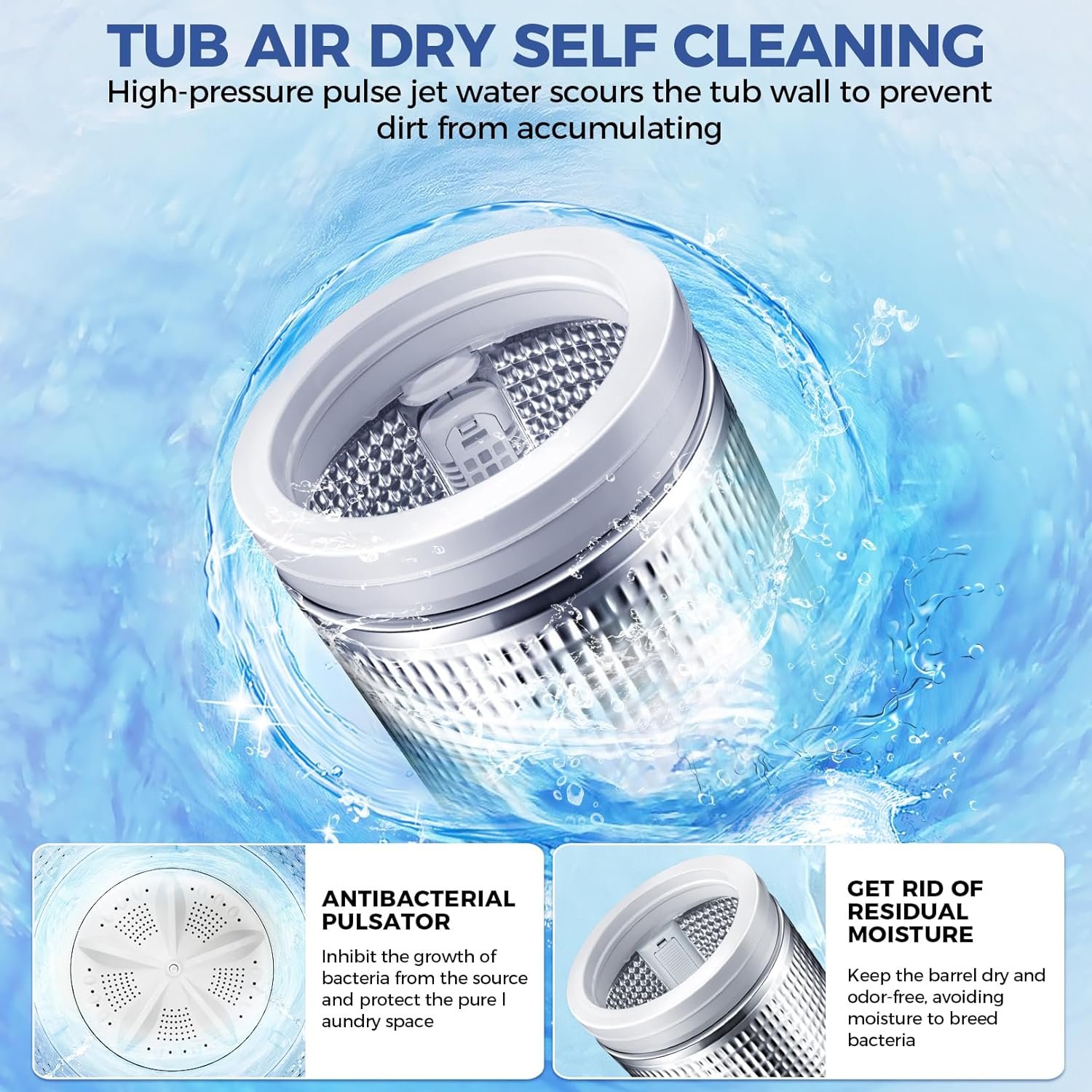 [Multi-Function] Small washing machine offers 10 washing modes, catering to various needs from gentle to intensive wash cycles. It comes equipped with a 24-hour delay function, tub-clean and child lock feature, it provides ample flexibility for selecting the optimal wash setting based on fabric type and stain level