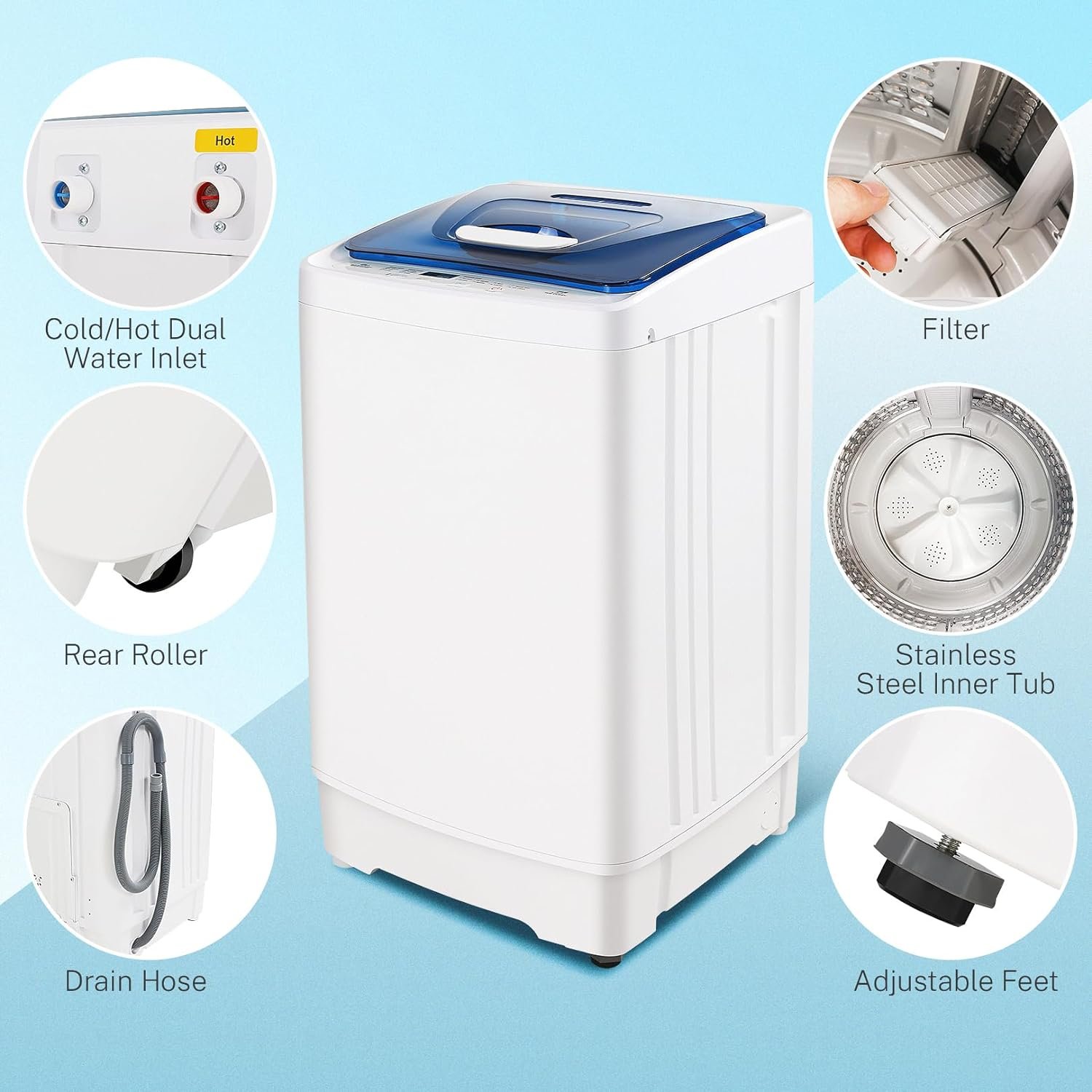 ✅【Multi-Function】This portable washing machine offers 8 wash programs to suit need from gentle to intensive washing. With dual hot and cold water inlets, 3 water levels for small, medium and large loads, and 3 temperature settings of cold, hot, and warm to meet your various laundry needs. Our portable washing machine also features an LED display and a transparent lid to check the cleaning progress of your clothes at any time.