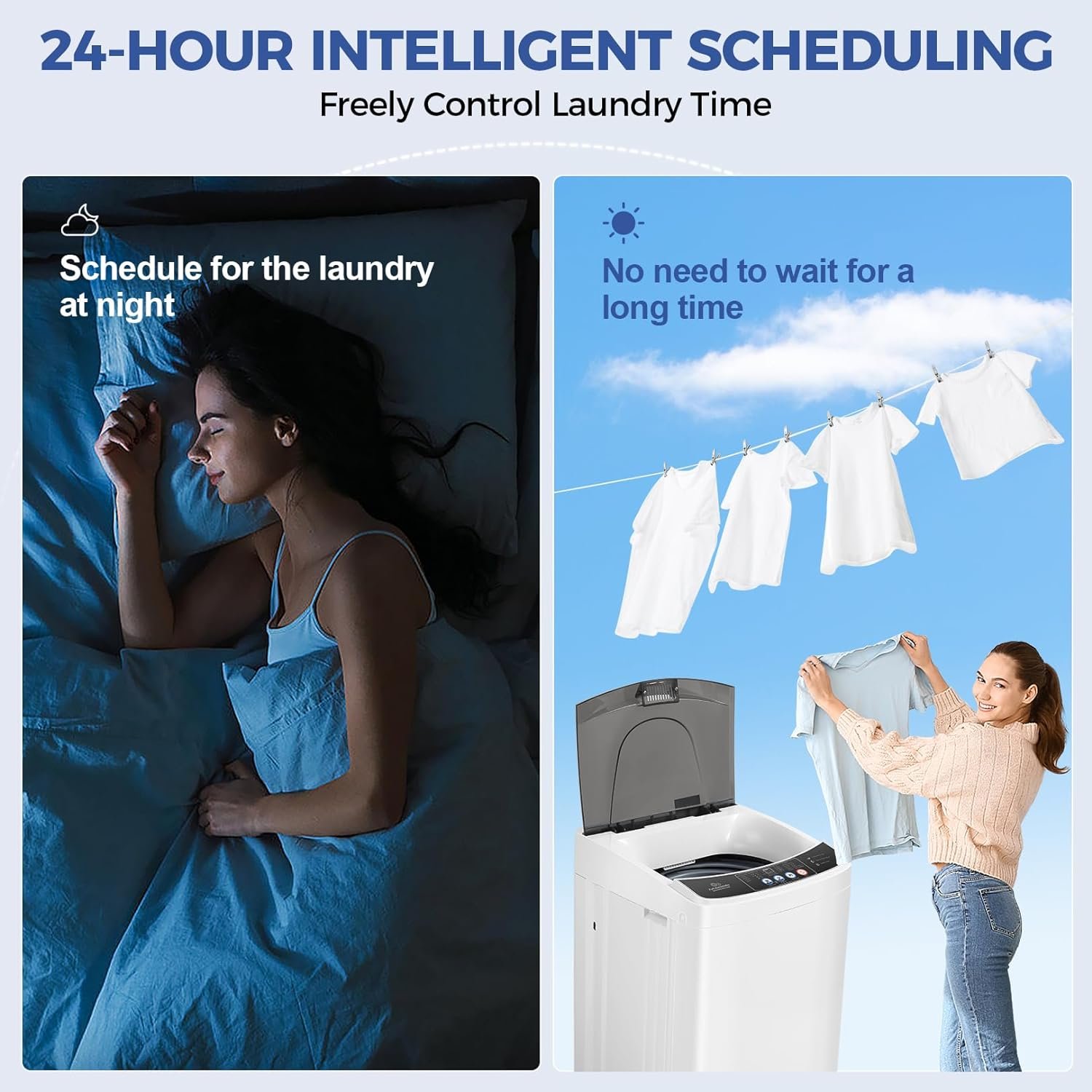 【More Peace of Mind & Worry-free】–When you don’t have free time to wait for your laundry, please use the 24-hour delayed start function of this portable washer, which can effectively help you to solve this problem. The safe child lock makes your family life more secure. The tub self-cleaning function makes your laundry environment healthier. The honeycomb-shaped stainless steel inner tank and fluff stain filter can effectively remove stains and hair on clothes, and reduce clothes wear.
