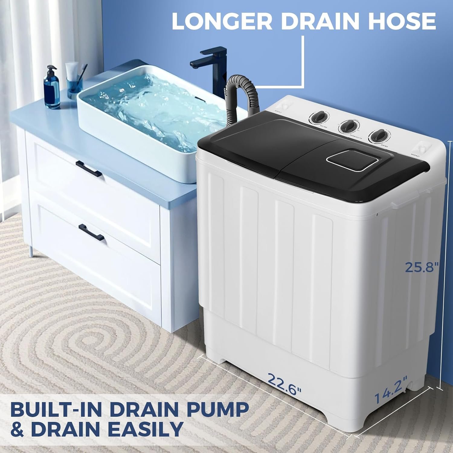 Twin Tubs Design — Portable washing machine features 2 separate tubs for washing and spin drying, allowing you to move clothes between the two or run both simultaneously. This design saves you valuable time and energy, making laundry a breeze