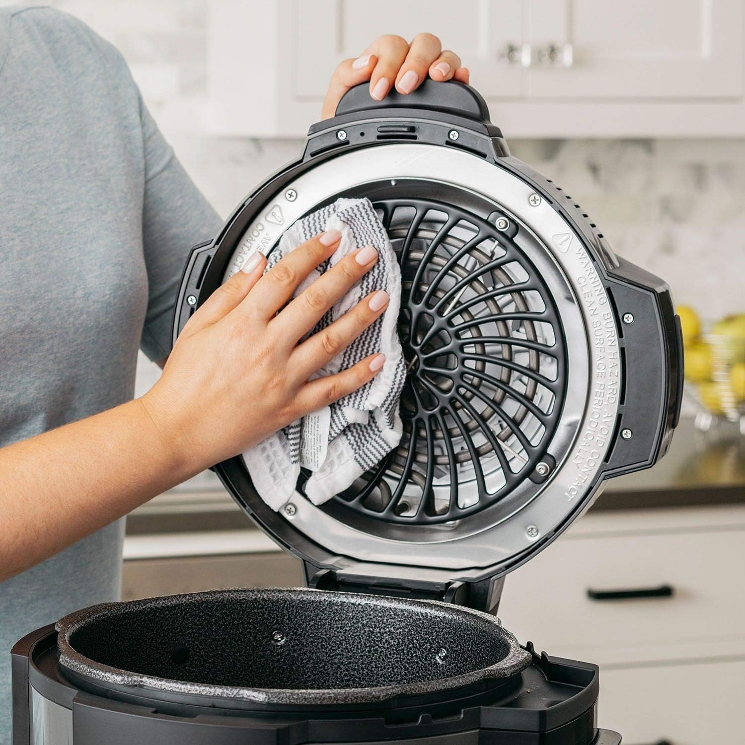 Includes: 1400-watt unit, crisping lid, pressure lid, 6. 5-quart ceramic-coated pot, 4-quart ceramic-coated Cook & Crisp Basket, stainless steel reversible rack (Recipe Book NOT Included)
