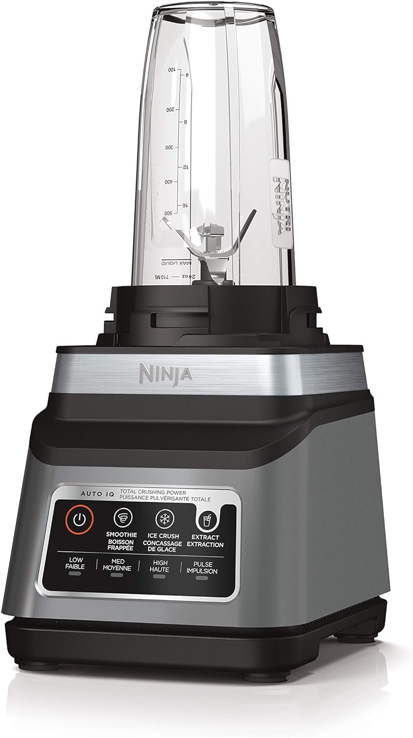 The Ninja Professional Plus Blender DUO with Auto-iQ features a new modern design and a more powerful motor than Ninja’s original Professional Blender DUO. Ninja Total Crushing Blades and Pro Extractor Blades Assembly give you perfectly crushed ice for your smoothies, frozen drinks, and nutrient extractions. The 72 ounces † Total Crushing Pitcher is great for making large batches for the whole family with 1400 peak watts of professional power. Plus, its single-serve cups with spout lids make it easy to take delicious, nutrient-rich smoothies on the go. Auto-iQ Technology provides preset pograms that do the work for you, no guesswork required. Versus BL621, based on operating wattag Extract a drink containing vitamins and nutrients from fruits and vegetables 64 ounces max liquid capacity