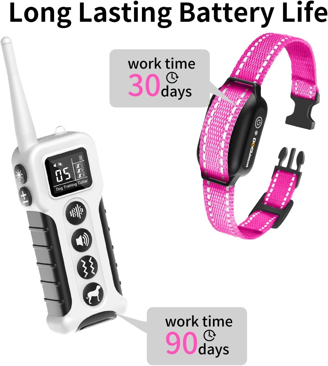 【 Long-lasting Battery Life 】 The rechargeable battery can be quickly fully charged in 2 hours. When fully charged, the remote control can be used for up to 30 days and the collar for up to 90 days.