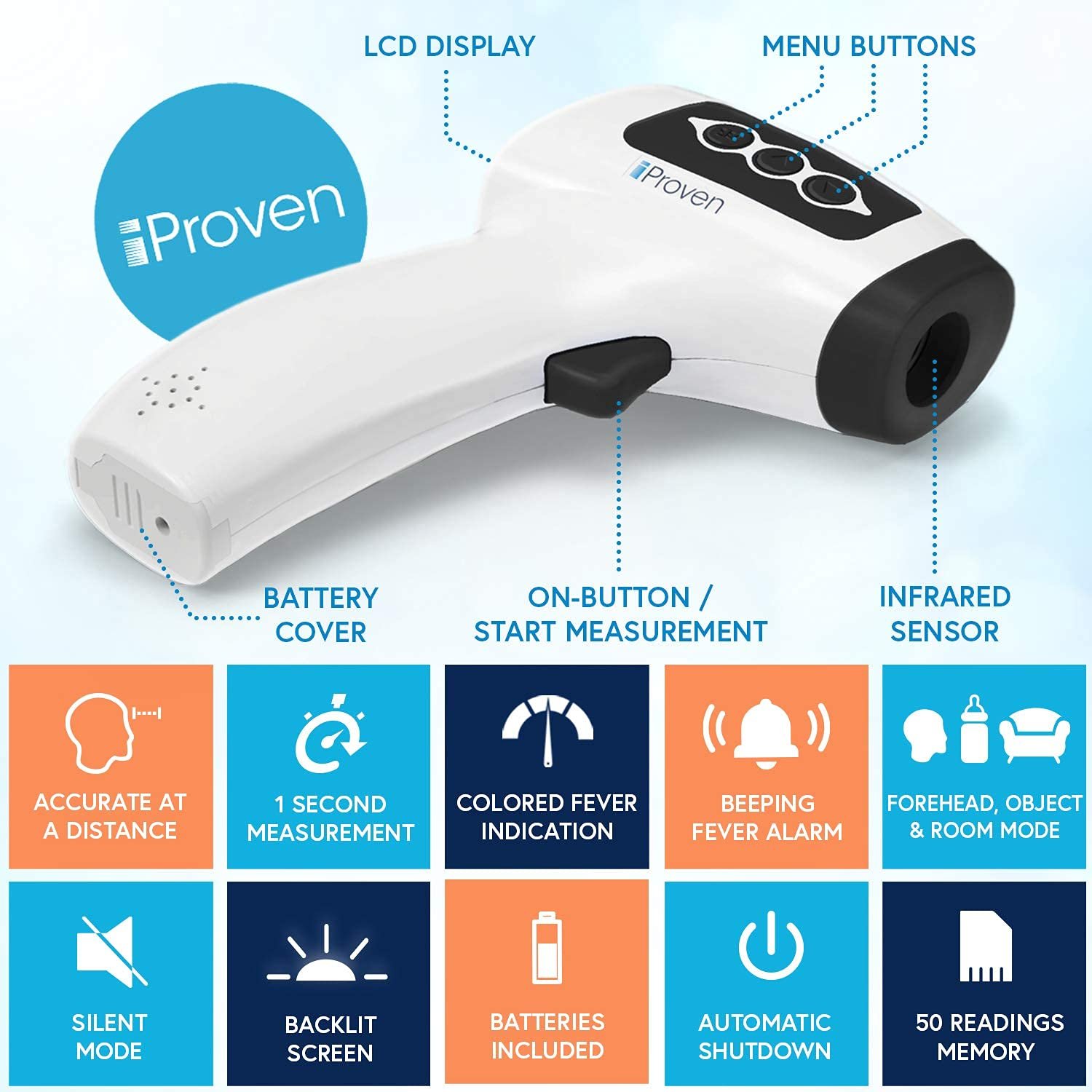 Memory Storages Up to 50 Readings – To keep track of your sick family member’s temperature, the infrared thermometer includes memory storages. Store up to 50 temperatures. Recall them the temps at any time to stay on top of the progression.