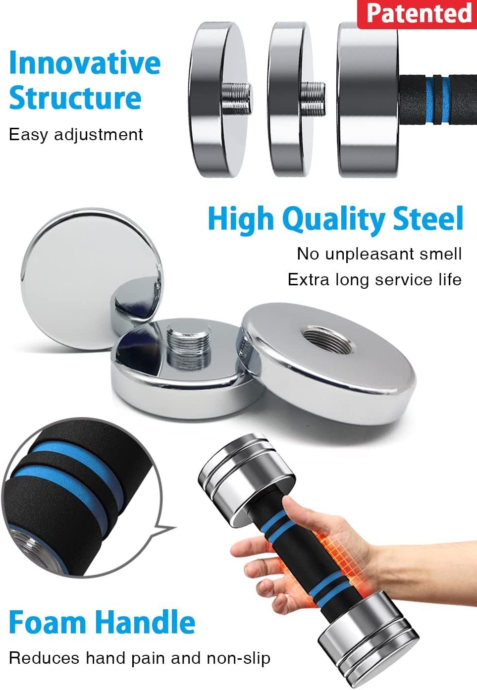 SAFE AND FIRM DESIGN: The dumbbell is precisely cut from a single piece of high-quality steel without any welding. Each dumbbell piece is locked to the next, avoiding the problems of traditional dumbbells in which the dumbbell piece shakes due to a loose nut. The handle is made of a foam material which is safe, non-slip, does not hurt your hands, reduces hand pain caused by heavy weight, and allows you to persist in completing the training.