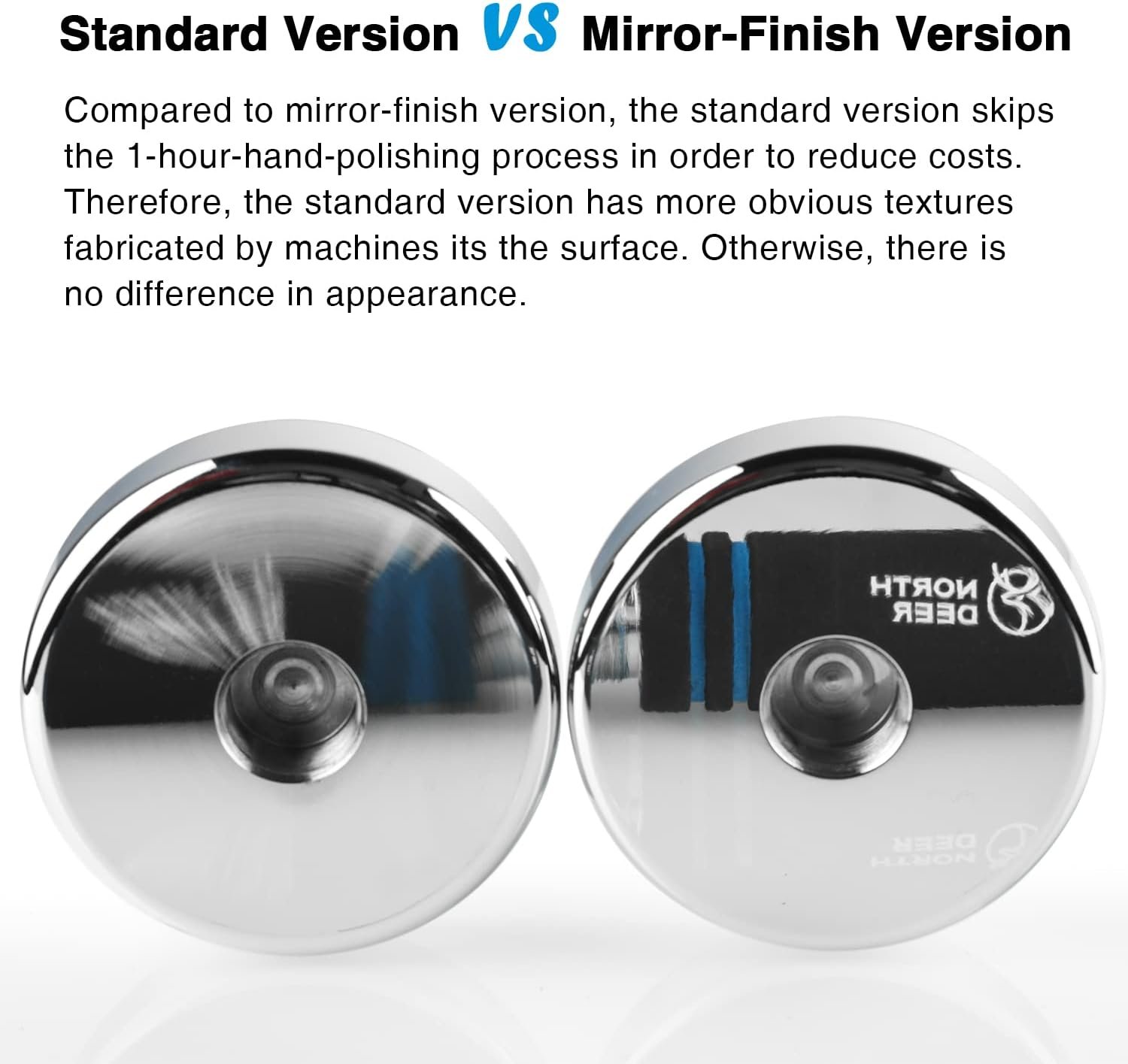 LITE-VERSION – FOCUS ON PRACTICABILITY: Compared to mirror-finish version, the standard version skip the 1-hour-hand-polishing process in order to reduce the costs. But don’t worry about the quality, because other production processes are exactly the same as with the mirror finishing version dumbbells. Since there are textures made by machines on each weight plate, they can’t reflect things as clearly as with mirror finishing version dumbbells, however, they are still shiny and look great.