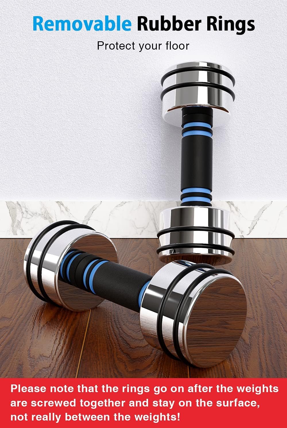 SUITABLE FOR HOME USE: Convenient due to its small size, easy storage, and ability to be placed upright. It is made of steel without plastic wrap and will not emit unpleasant odors, which would usually affect the mood of your exercise. The minimalist shape and highly polished surface give people the feeling of artwork in the home. The attached rubber rings can be easily installed in the groove of the dumbbell to avoid abrasions to the floor.