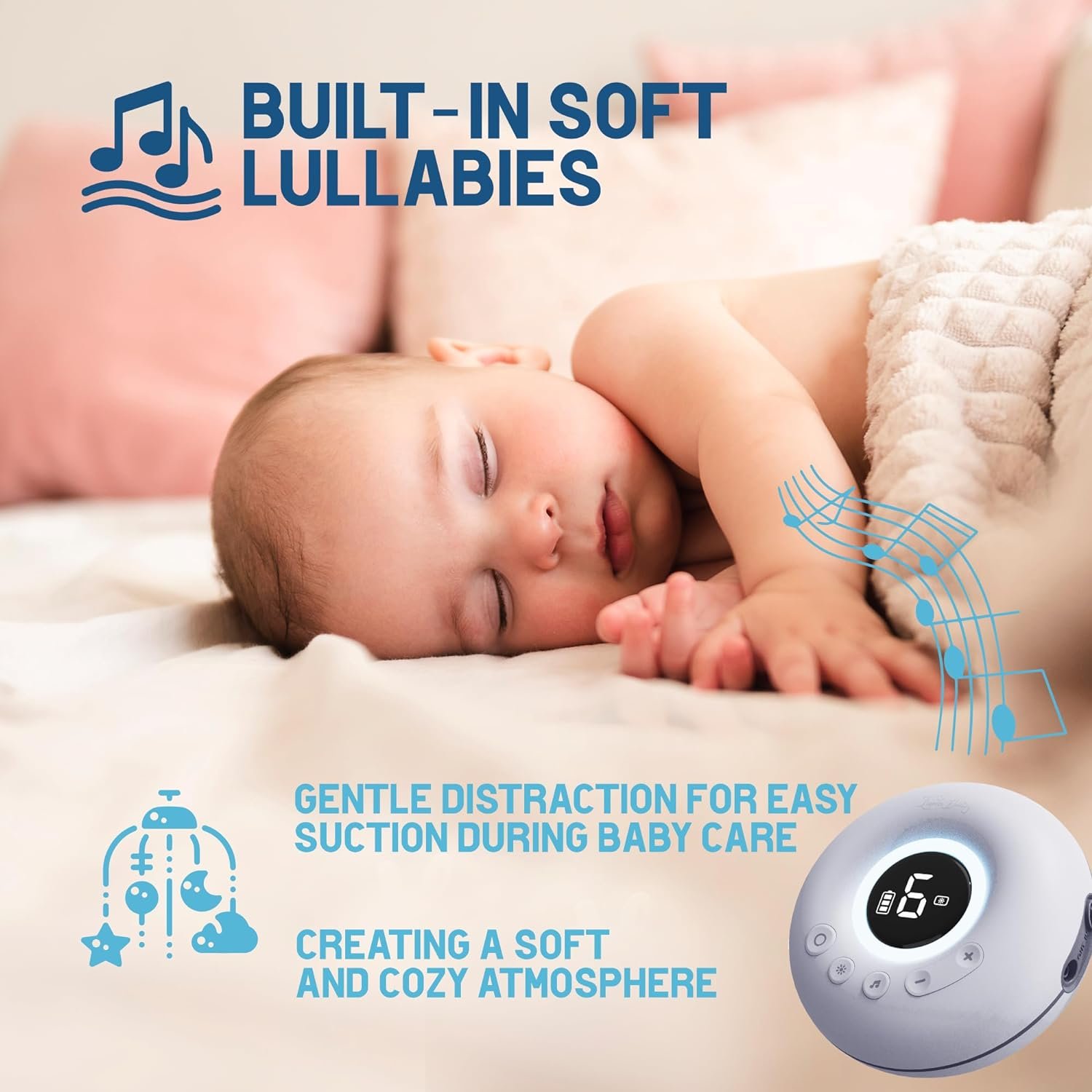 Calming Light with Integrated Soothing Music: Lunobaby NosePro innovative design incorporates a soft ambient light that casts a gentle glow, creating a serene atmosphere. Paired with soothing melodies, ensuring a stress-free experience for your little one during nasal suctioning.