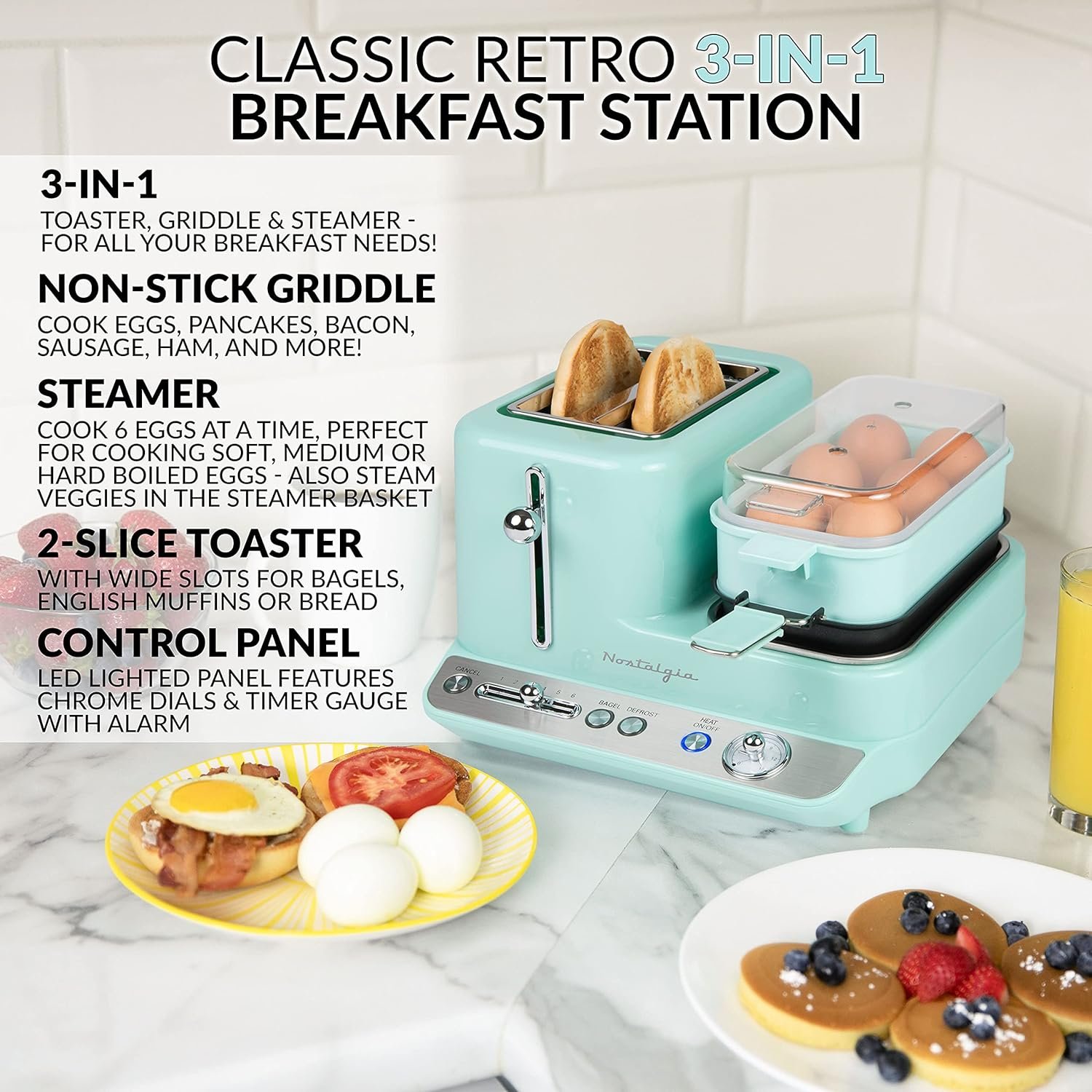 Product 2: ULTIMATE BREAKFAST STATION: This 3-in-1 breakfast station will satisfy all your breakfast needs. Cook your eggs, bacon and toast all at once with this beautiful retro breakfast station. Makes lunch sandwiches, too.