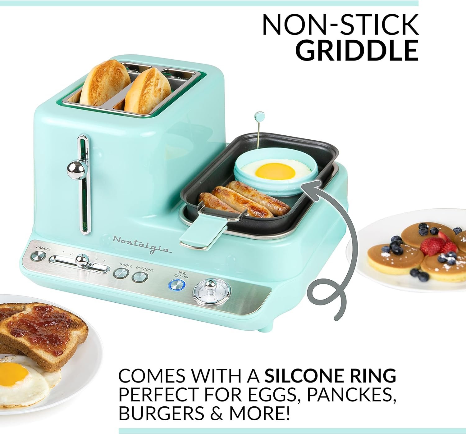 Product 2: NON-STICK GRIDDLE: Cook your eggs, bacon, ham, sausage on the easy-to-clean non-stick griddle. Use the silicone egg ring to perfect your eggs, pancakes, burgers and more