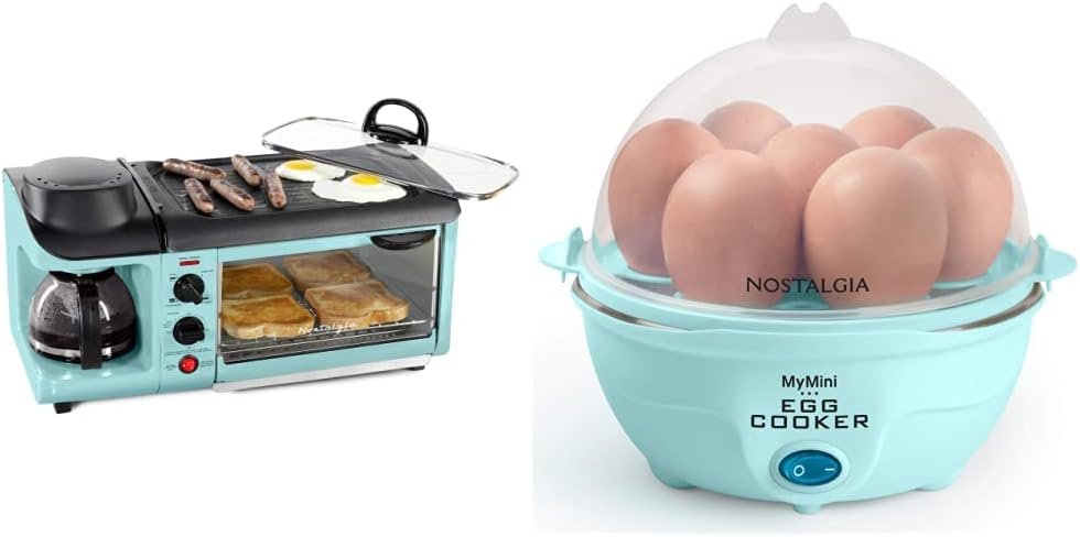 All-in-one breakfast solution with coffee maker, large griddle, and 4-slice toaster oven to cook a variety of breakfast foods.