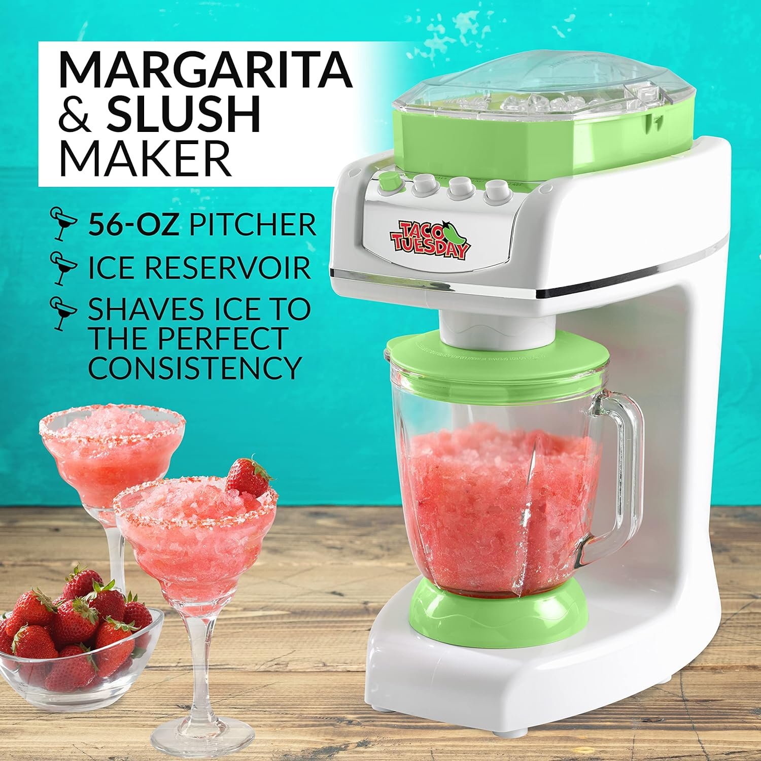 Bring refreshing beverage blending fun to any occasion with the Taco Tuesday Margarita & Slush Maker. The powerful motor quickly shaves ice to the perfect consistency and makes up to 56 oz. of your favorite slush drink. The easy-flow spout dispenses consistently smooth frozen drinks while the blending chamber detaches from the base for easy cleanup. Includes a detachable cup rest and drip tray.