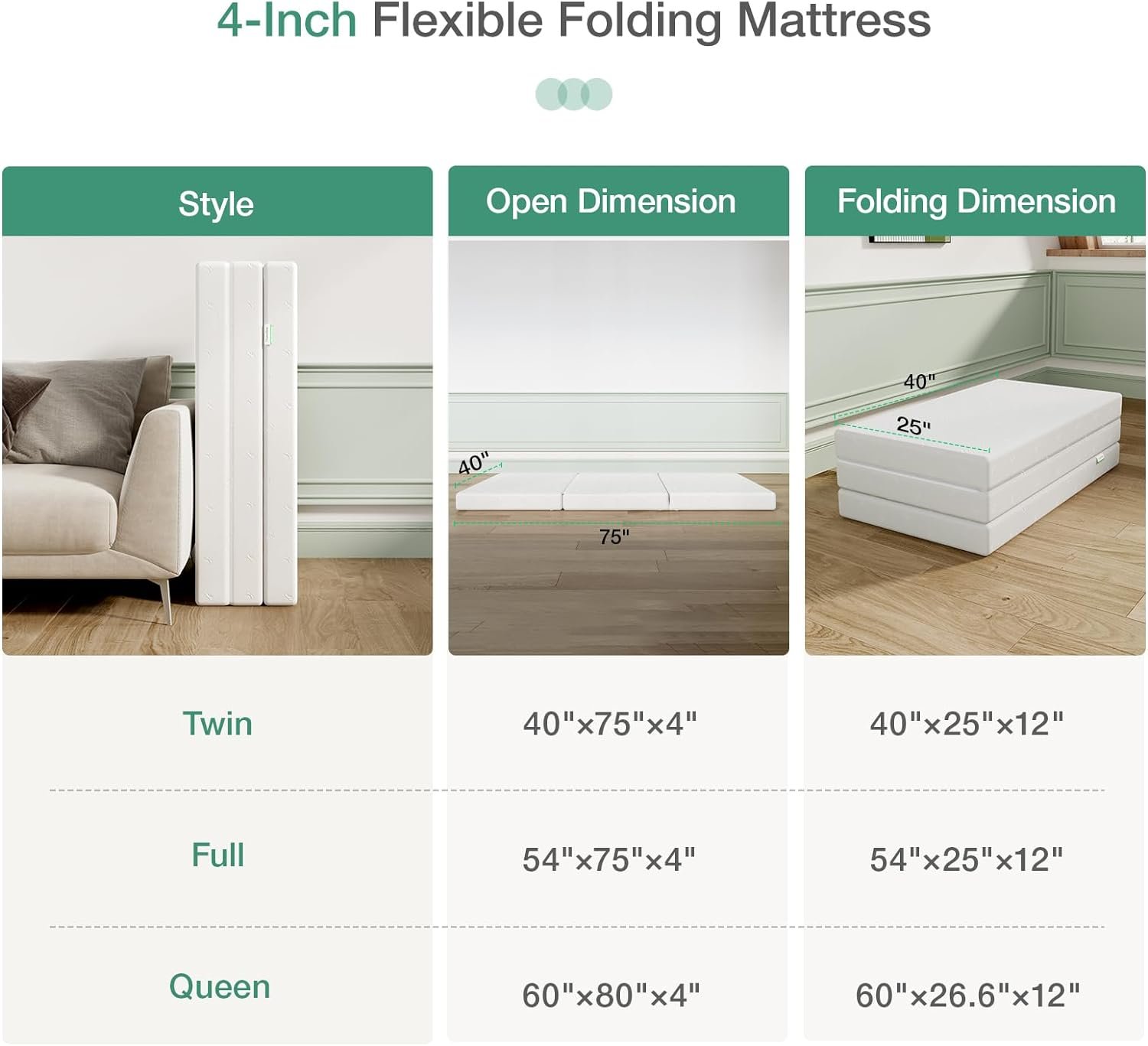 PORTABLE MATTRESS FOR MULTIPURPOSE- The foldable mattress is easy to store and carry. It’s space-saving and practical, especially in a small room. The queen folding mattress can serve as an RV mattress for road trips, a playing mat for kids, or a temporary guest bed for accommodating guests. Plus, it’s suitable for those who move often.