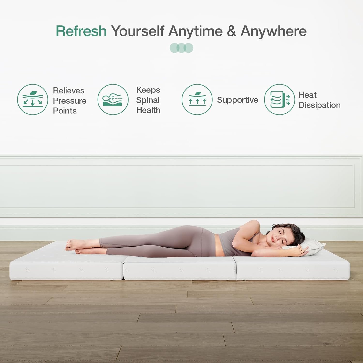 RELAX IN MORE THAN ONE PLACE & ONE WAY- This portable queen trifold mattress supports every contour of your body to help with pressure relief and spine alignment. You’ll enjoy a peaceful rest and refresh yourself anywhere. Besides being a foldable floor mattress, it’s multifunctional and can be folded into a sofa, cushion, or foldable mattress topper as needed.