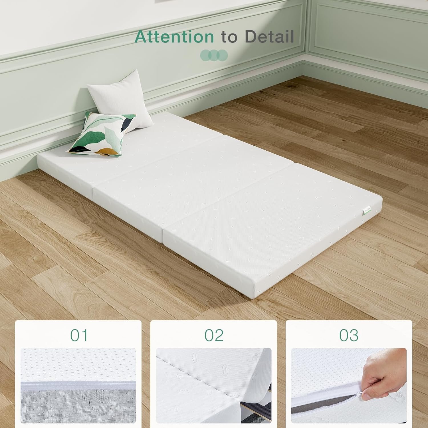 This 4-inch queen Novilla folding mattress is made of responsive comfort foam with higher density, and it’s covered with a soft and breathable fabric. Also, the cover is removable and washable. The portable folding mattress can automatically adjust according to the spine curves of the human body and effectively relieve pressure, so you’ll enjoy a peaceful rest and refresh yourself anywhere. Besides, the trifold mattress can dissipate heat to relax your body for deep sleep. Coupled with the 2 layers of high-density comfort foam, the tri-folding mattress is not too soft or too firm so sleepers can sit/sleep on it without feeling what is below them, or having back pain. We are committed to creating a comfortable and affordable mattress for our customers. More importantly, our trifold mattresses have been certified by CertiPUR-US and Oeko-Tex Standard 100, the SGS test, so you can rest assured and enjoy your new foldable mattress!