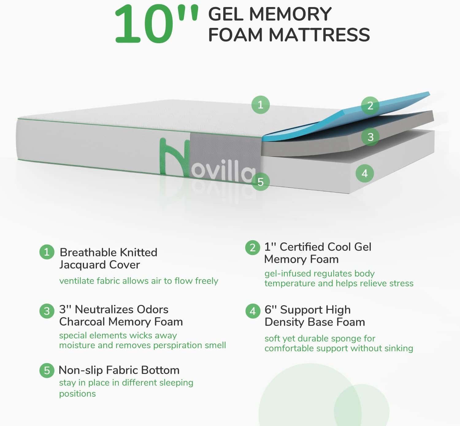 【Bed in a Box Easy to Move】Such fun to receive a mattress in a box. Novilla 10 inch queen mattress is compressed by vacuum, rolled and shipped in a box conveniently to your door for easy set up. Since the mattress is crimped and compressed in a box, please allow 48-72 for the mattress to expand and regain its normal shape, the rate of expansion will be affected by the room temperature.