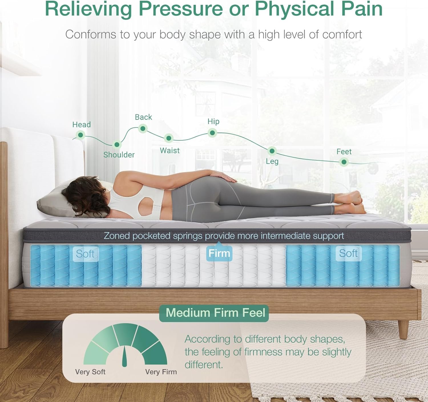 【Optimal Support and Comfort】: Novilla innerspring mattress utilizes independently wrapped pocket coils for targeted support. The foam comfort layer conforms to your body, relieving pressure on shoulders and hips and promoting proper spinal alignment. As a result, this queen bed mattress has a balanced and comfortable sleeping surface that optimizes overall comfort.