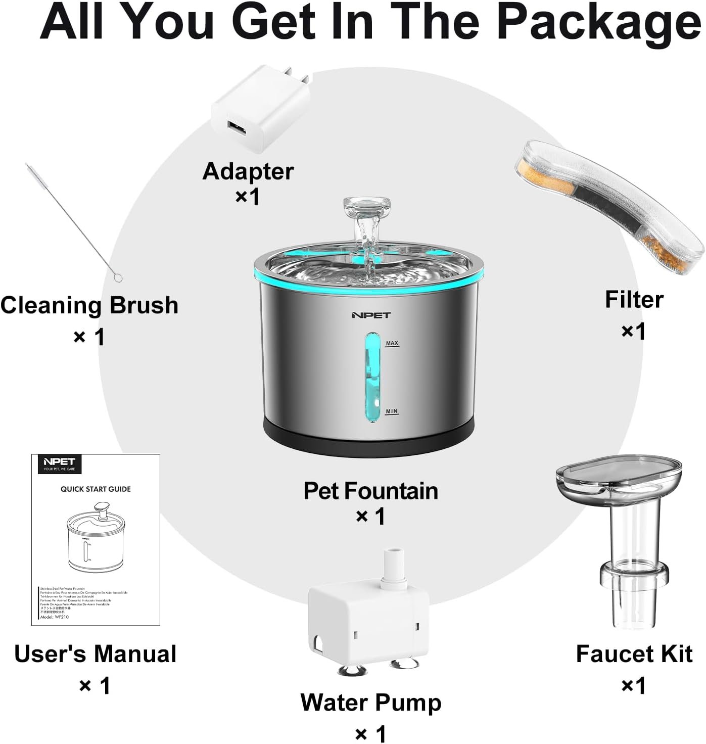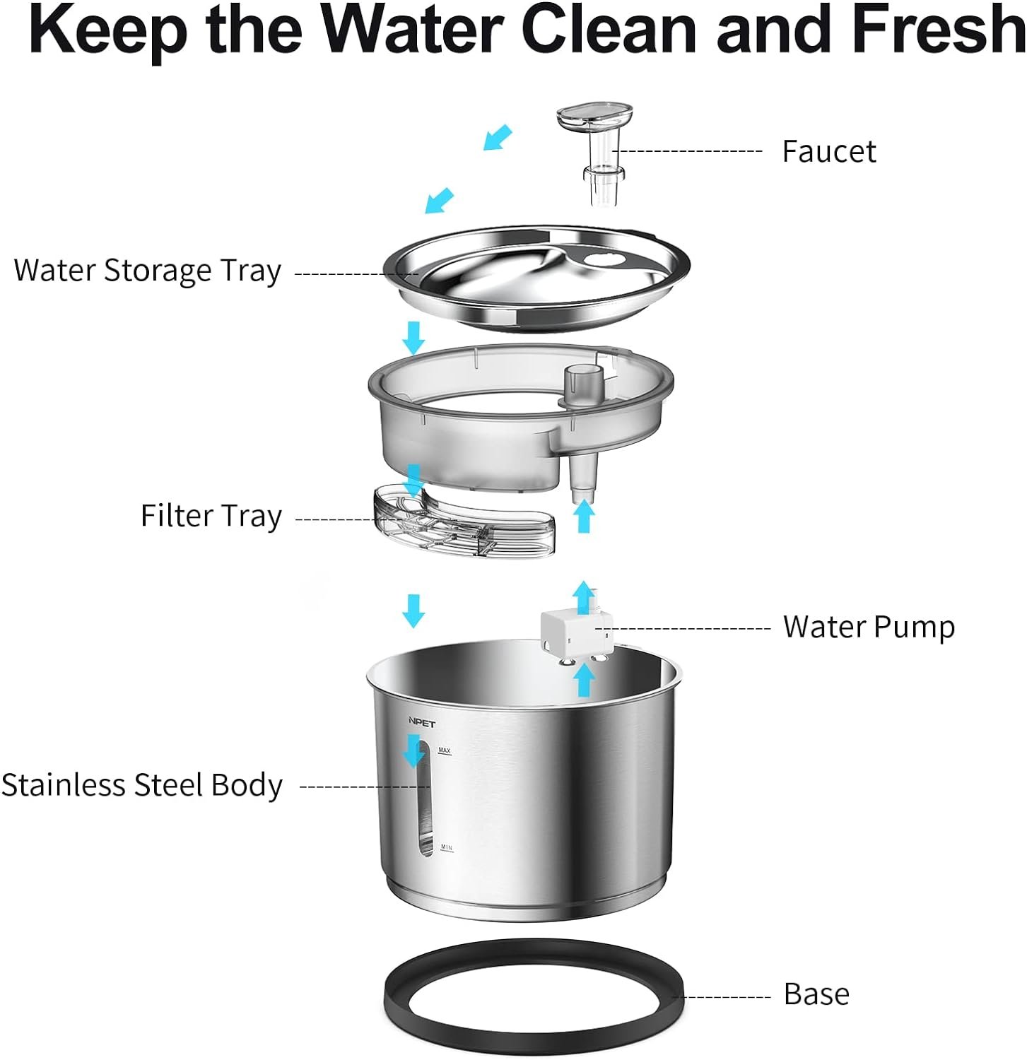 304 Stainless Steel: The fountain is made of food-grade and dishwasher-safe 304 stainless steel material which is durable and rust-preventive. Cleaning and assembling are quite easy. Stainless steel upper cover and stainless steel water tank can be put into the dishwasher cleaning. Hand-wash and dishwasher are available. There is a non-slip base on the bottom that prevents the pet water dispenser moving.