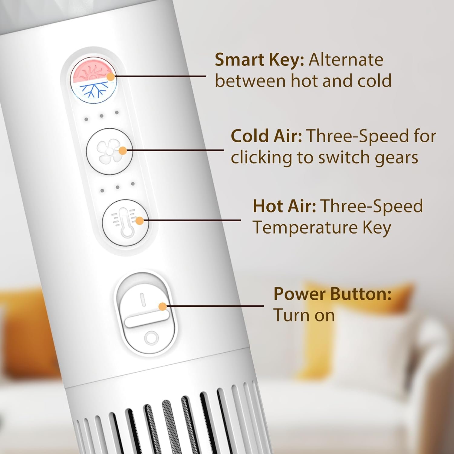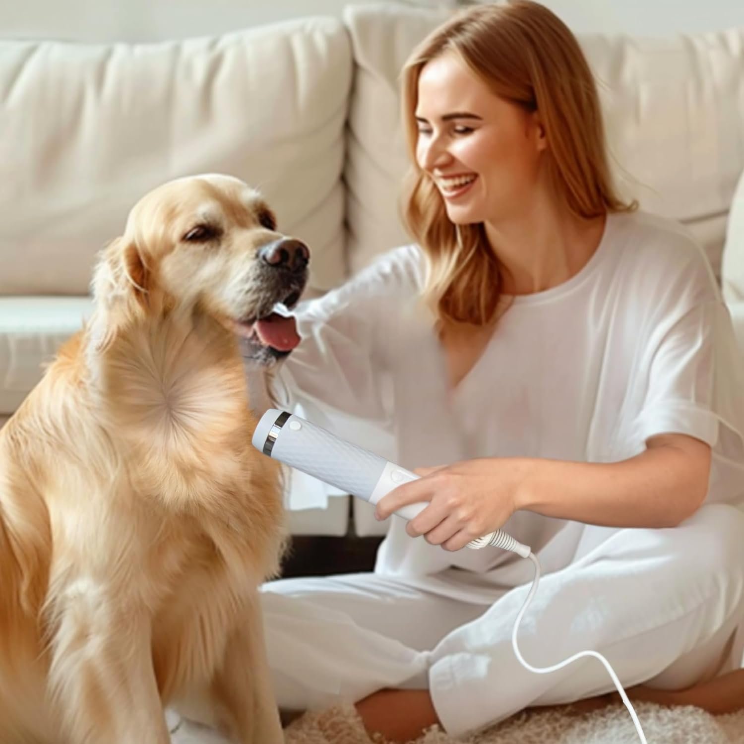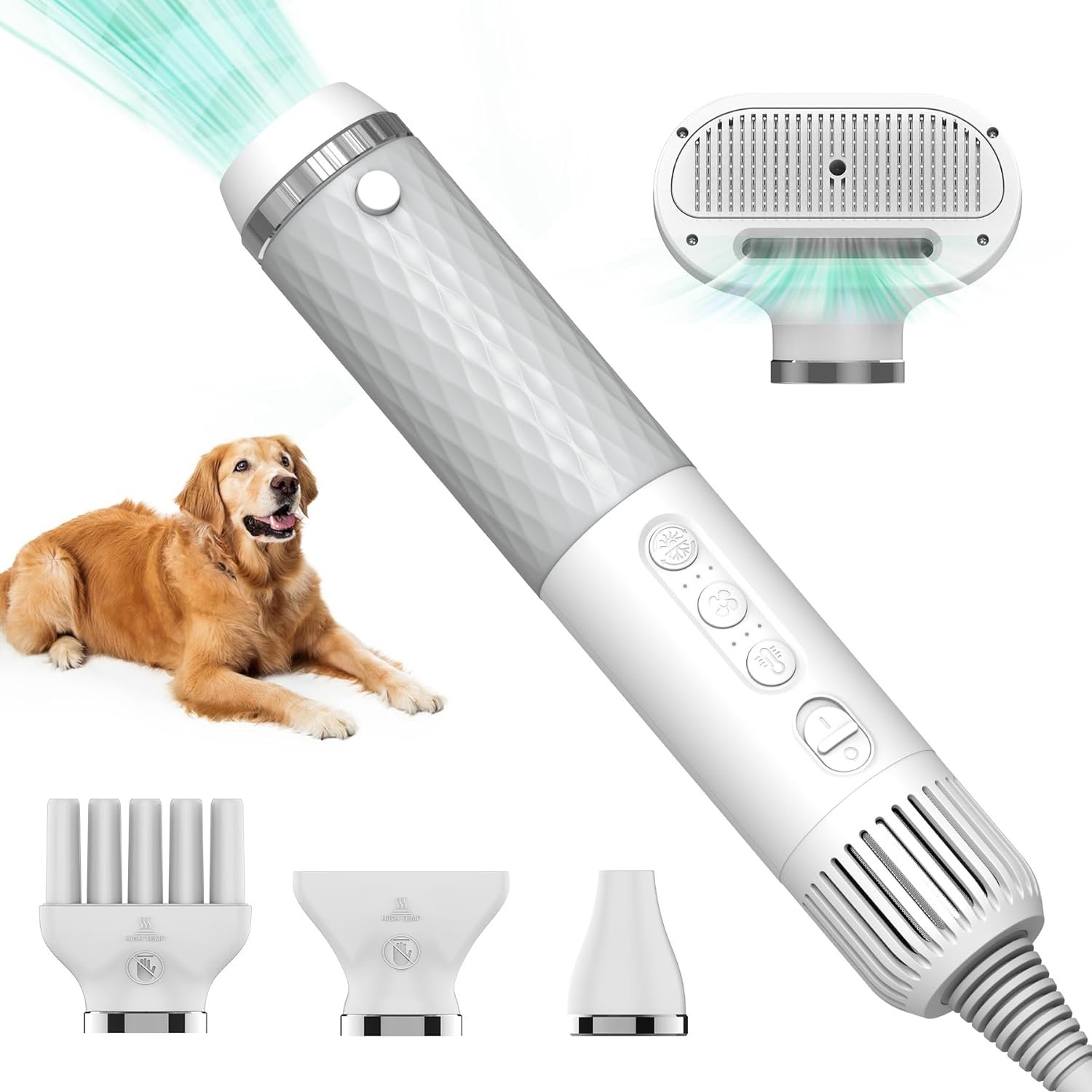 The dryer for dogs with four extra replaceable accessories: Dog grooming brush dryer (for grooming combing and styling, with one-touch de-fluffing) Concentration nozzle (for hair fluffy) Wide flat nozzle(fit releases negative ions and smooths pets’ hairs) Wide tooth comb nozzle (for hairy and long-haired pets, smooth to open knot )